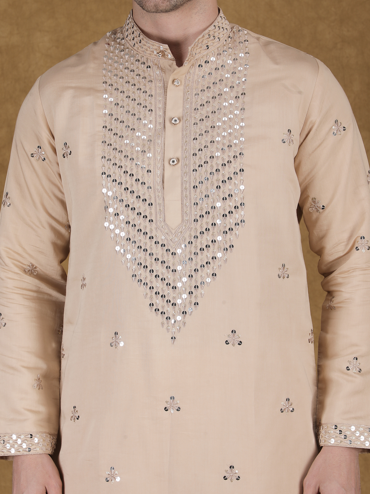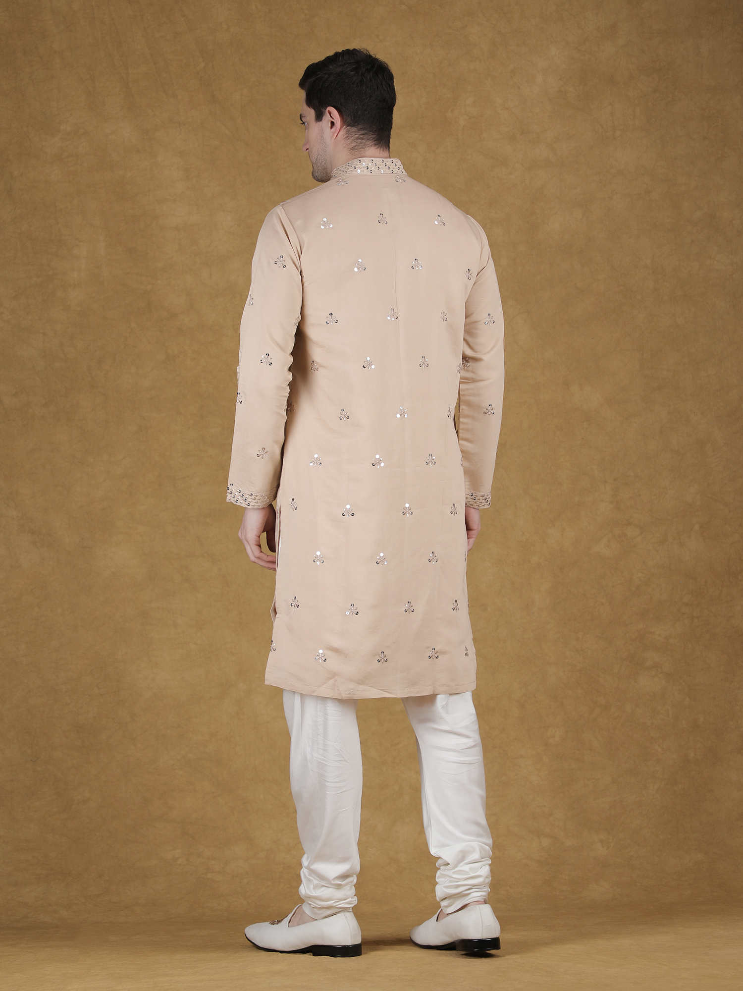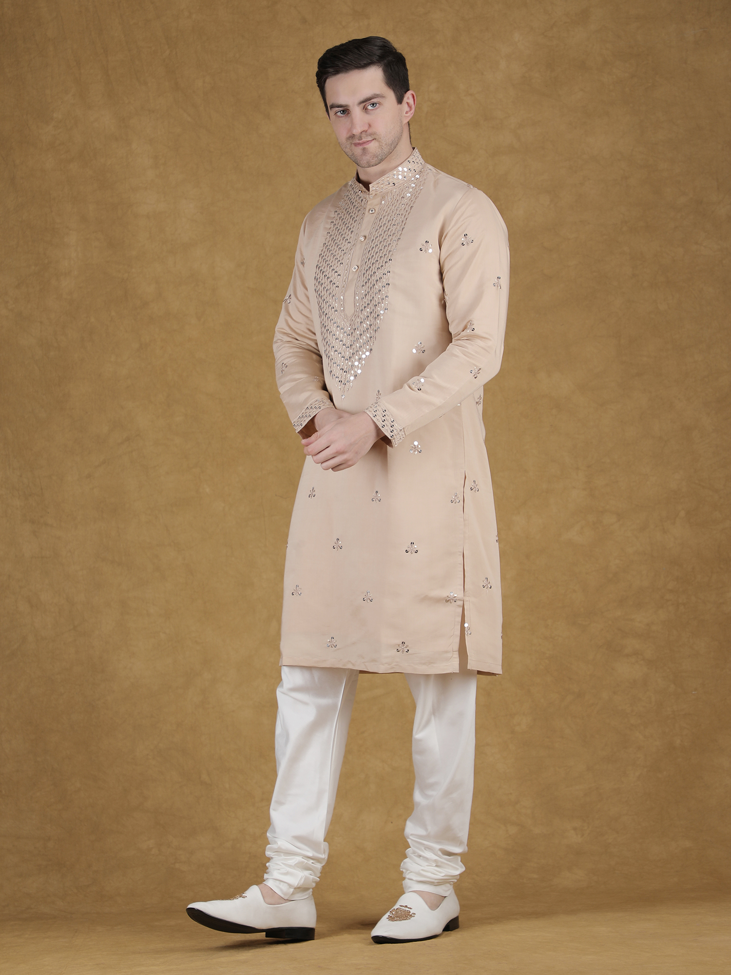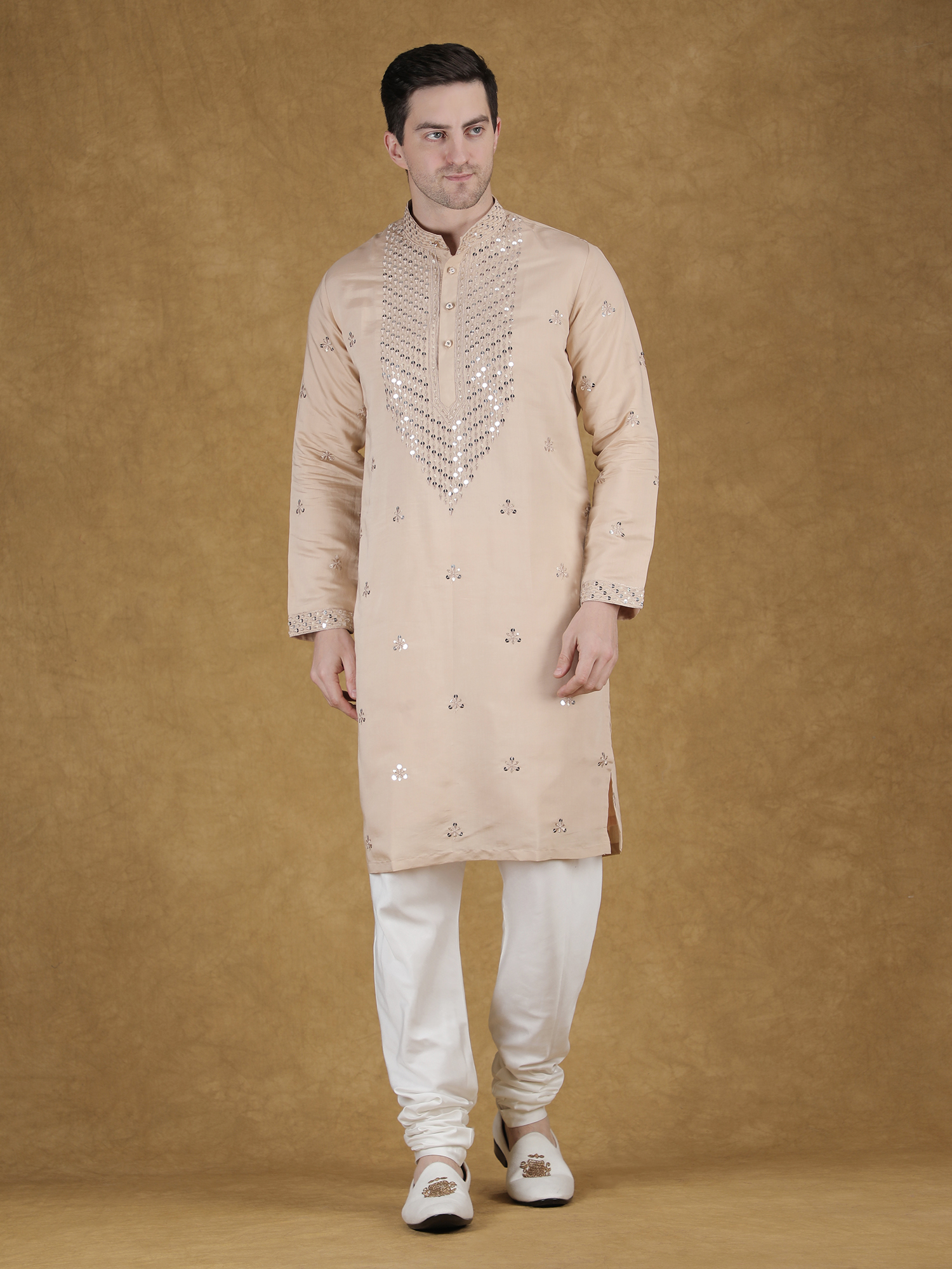 This Beige Mirror Embroidery Kurta Set is designed for reception occasions where soft tones and reflective detailing create a refined and elegant look. The kurta features a structured embroidery panel on the front with fine thread work combined with mirror embellishments, which adds depth and shine to the outfit. The mirror elements catch light subtly, so they enhance the overall appearance without making it heavy. Therefore, this Beige Mirror Embroidery Kurta Set becomes an ideal choice for men who want a balanced mix of tradition and modern style for reception events. Moreover, the soft beige tone gives the outfit a graceful and premium appeal.