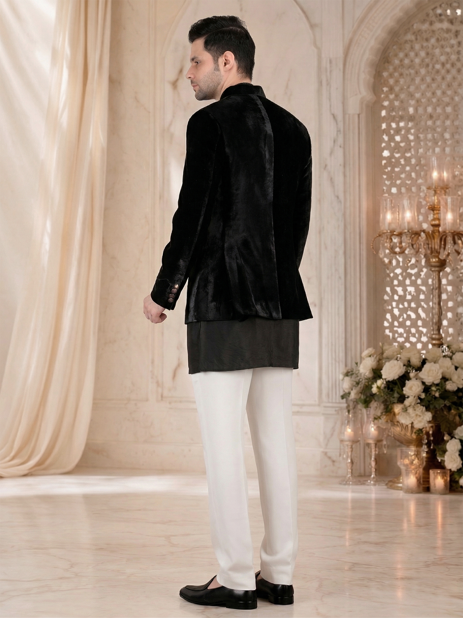This bandhgala works perfectly for reception events and evening functions where a stylish presence matters. The black velvet and detailed embroidery create a strong and elegant look. Therefore, you can carry this outfit with confidence and stand out easily.