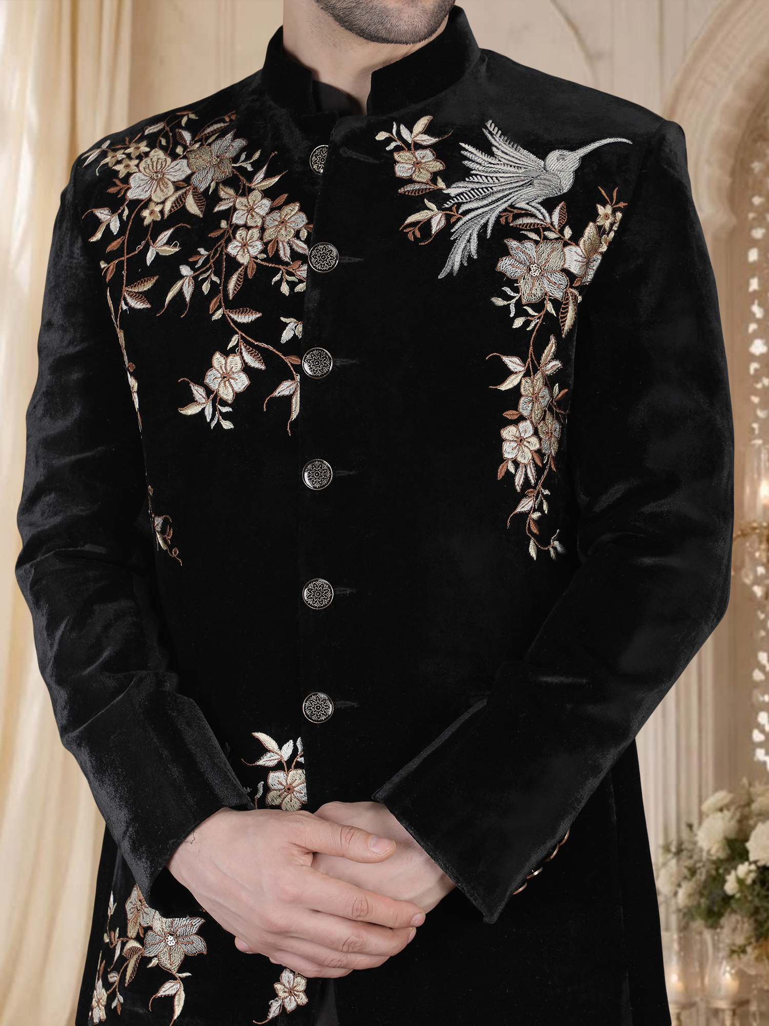 This Black Bird Embroidery Bandhgala is made for reception occasions where style and detail create a strong impression. The rich black velvet fabric gives a smooth and premium base, while the bird and floral embroidery adds depth and character to the outfit. The embroidery flows across the chest and shoulder in a balanced way, which makes the design look artistic yet clean. Therefore, this Black Bird Embroidery Bandhgala becomes a perfect choice for men who want a bold and refined look. Moreover, the velvet surface enhances the shine of the threads, so every detail appears more sharp and visible.