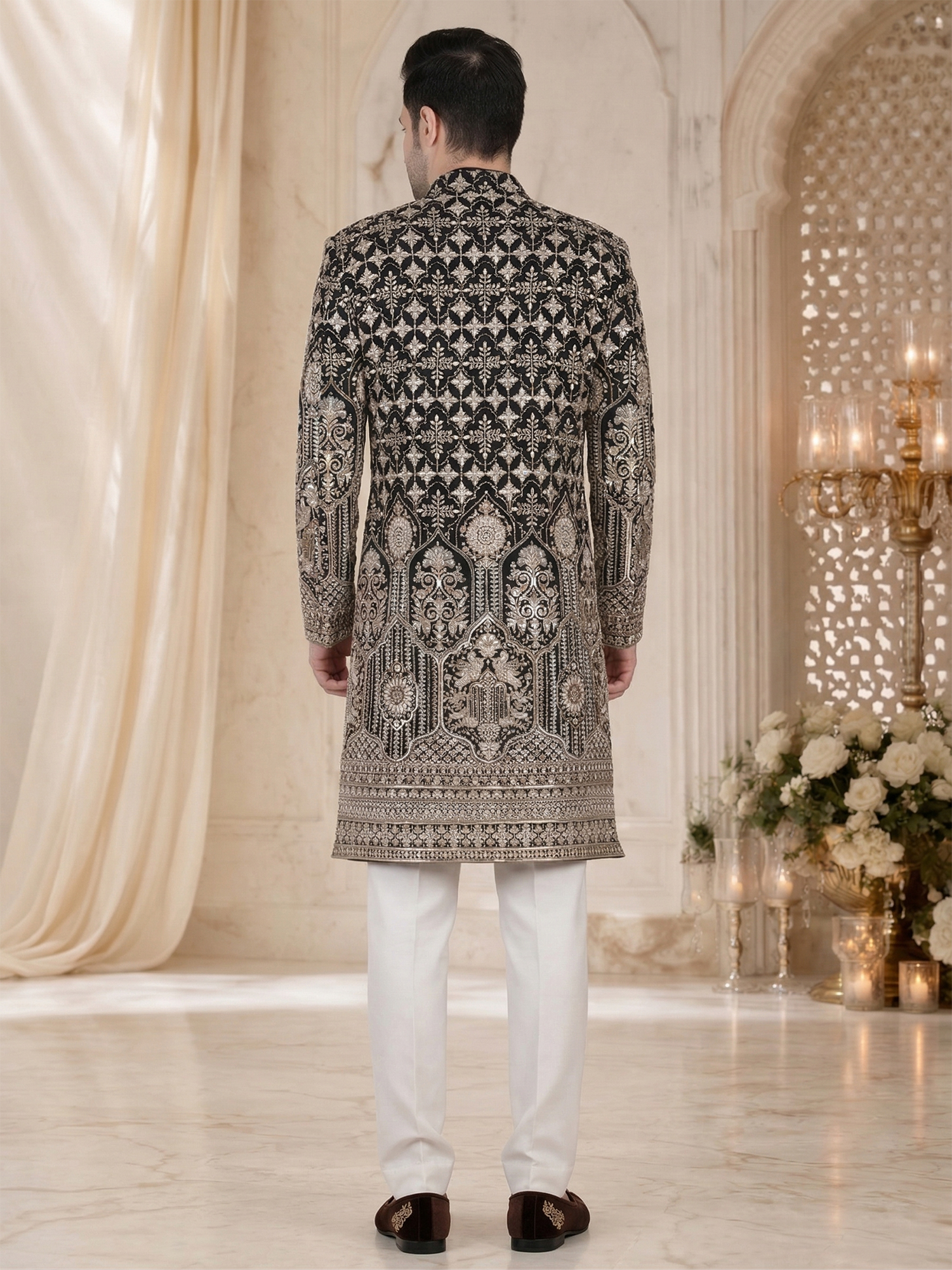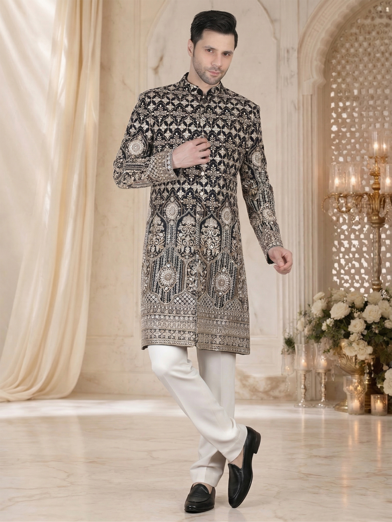 Pair this sherwani with white or ivory churidar for a balanced and elegant look. Add a statement brooch or layered accessories to enhance the embroidery. Complete the outfit with embroidered mojris or formal loafers.