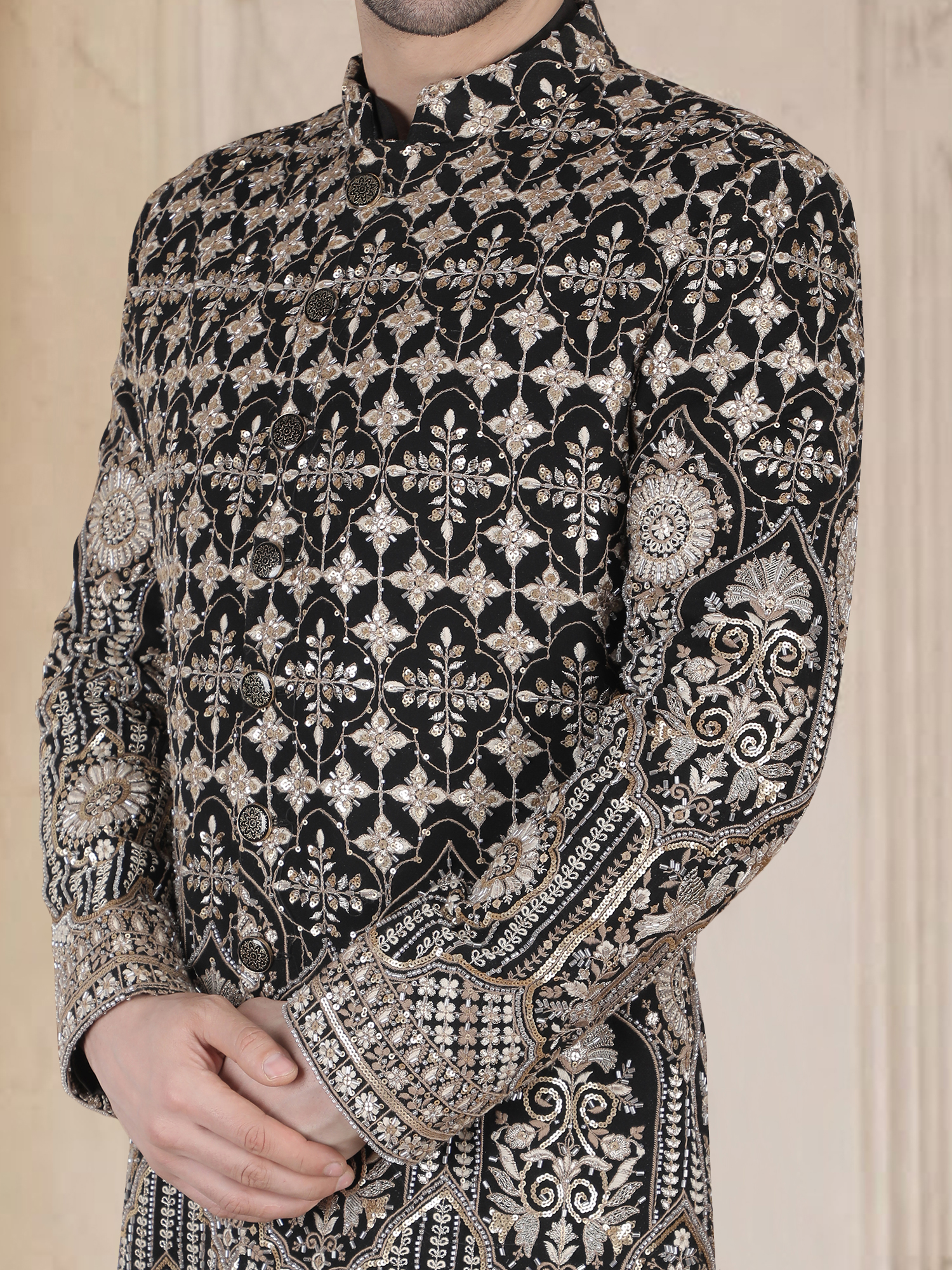 We craft this sherwani using premium fabric that supports dense zari embroidery while maintaining comfort and structure. The embroidery is evenly distributed across the outfit, forming a continuous pattern that creates a rich and uniform surface. You can clearly notice the precision and consistency of the zari work, which reflects skilled craftsmanship. The intricate detailing, especially in the lower panel and sleeves, adds depth and visual strength to the design. The antique zari finish provides a soft glow, enhancing the texture without making the outfit overly bright. Also, the clean borders and detailed panels add a refined finishing touch. Moreover, the stitching and tailored construction ensure durability and a sharp fit.