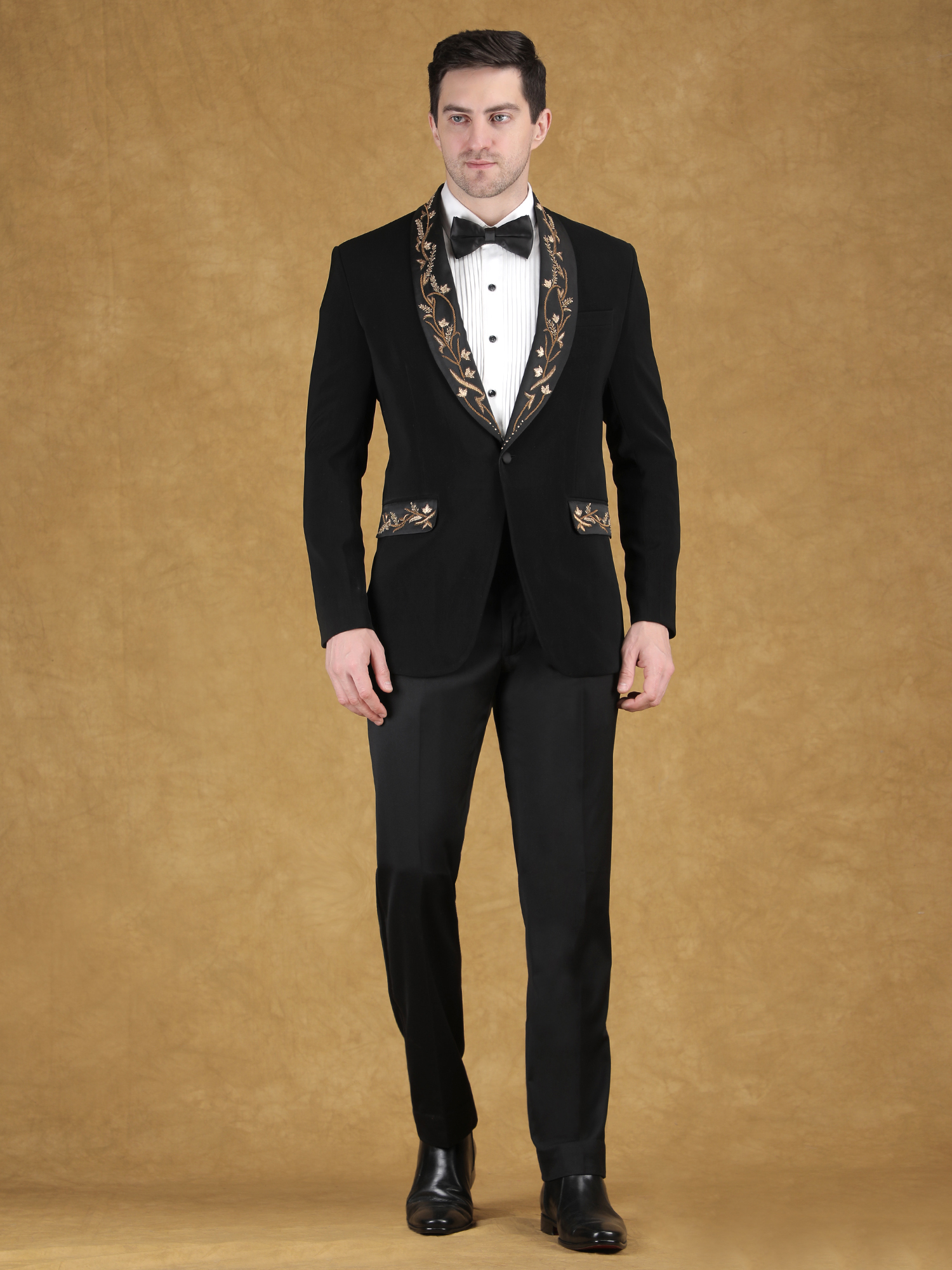 Pair this tuxedo blazer with a white shirt and black bow tie for a classic formal look. Keep accessories minimal to highlight the zari embroidery. Complete the outfit with formal black shoes.