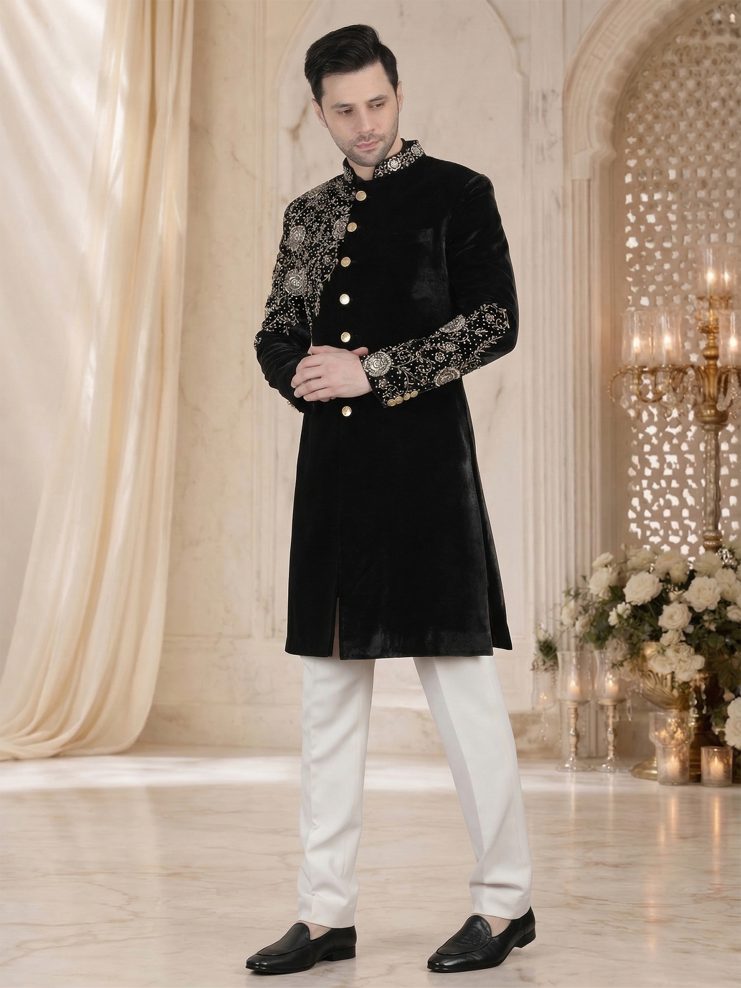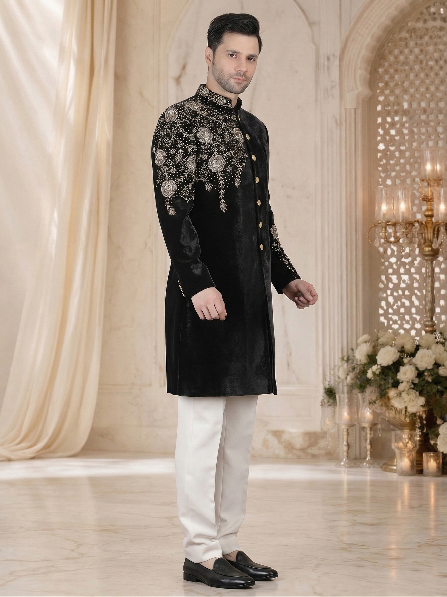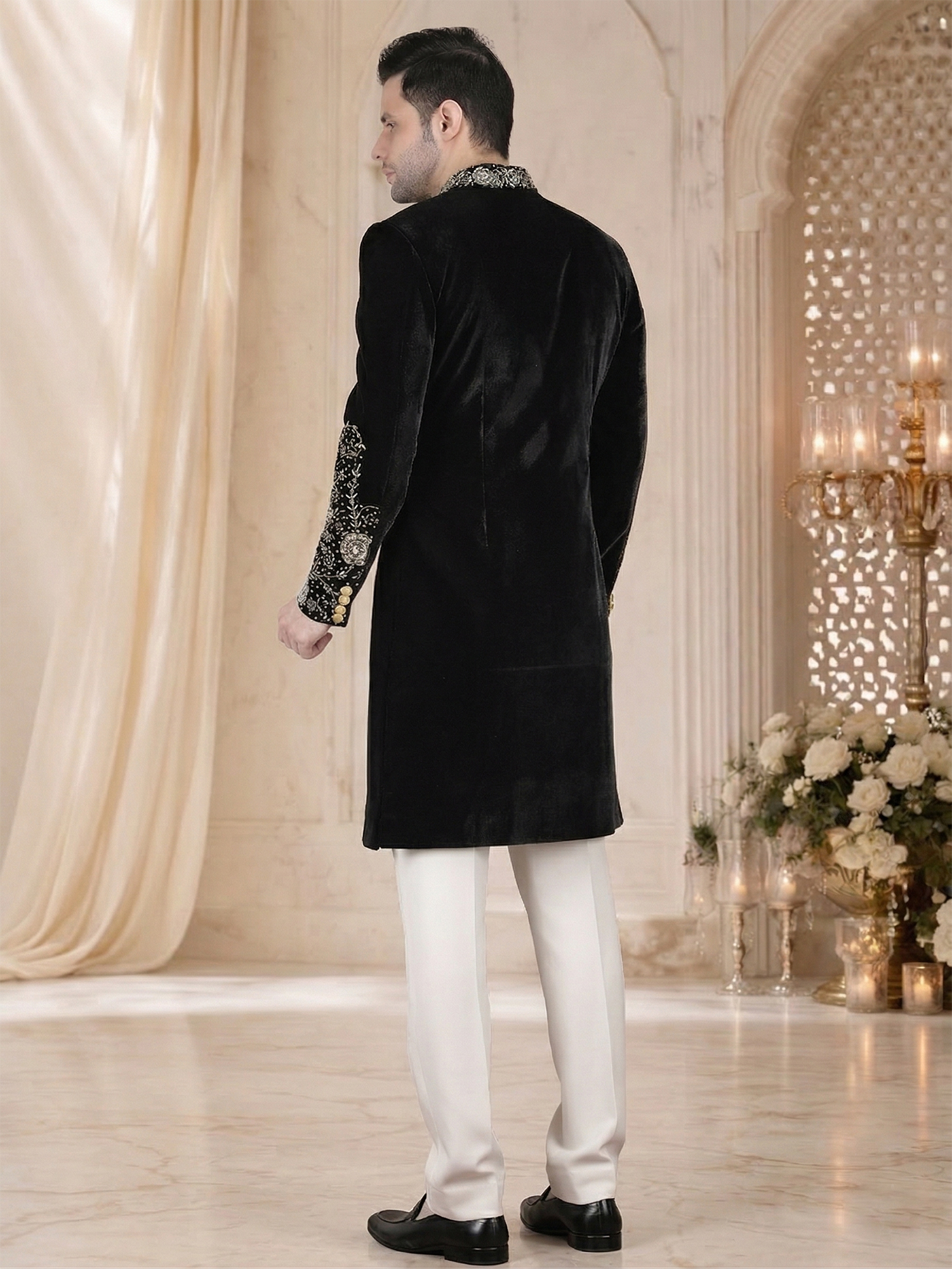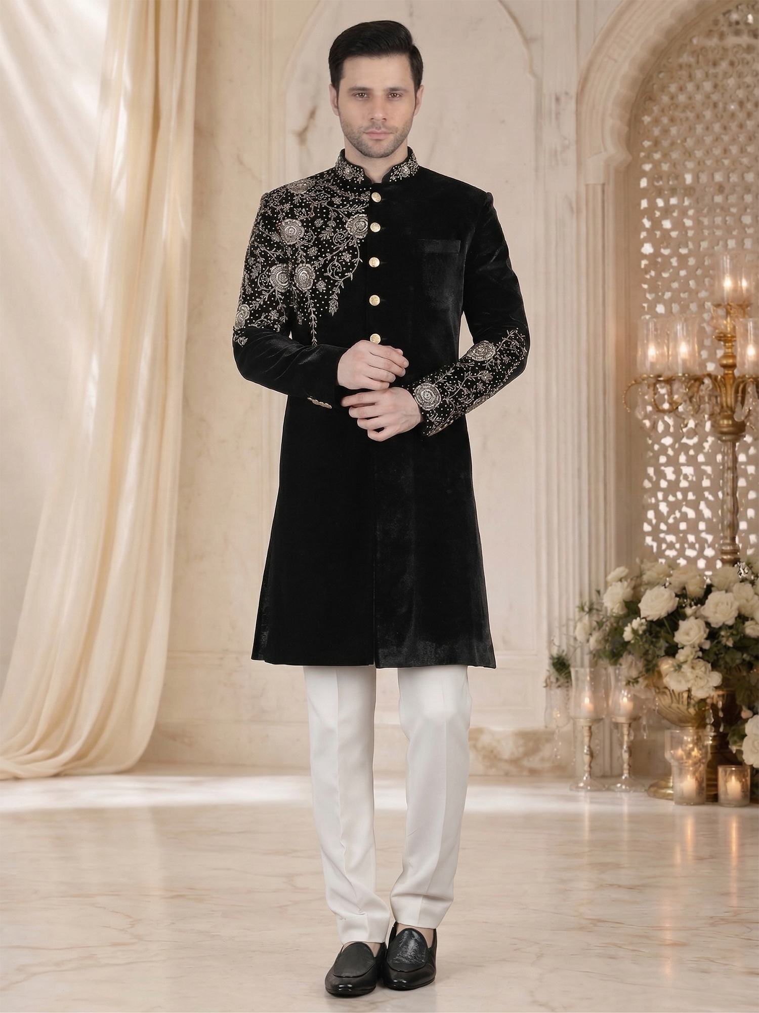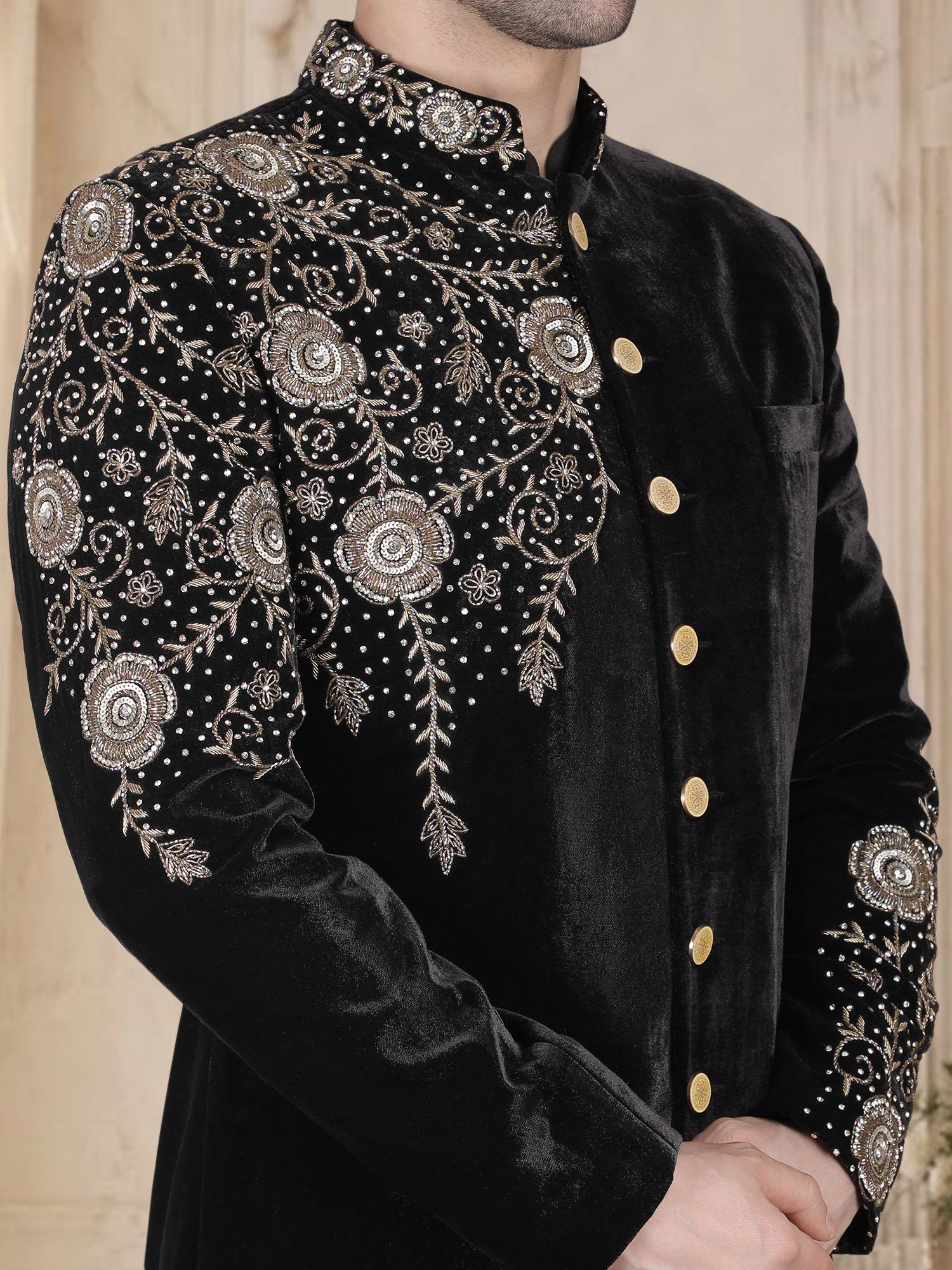 Black Velvet Reception Sherwani with Gold Zari Floral Embroidery