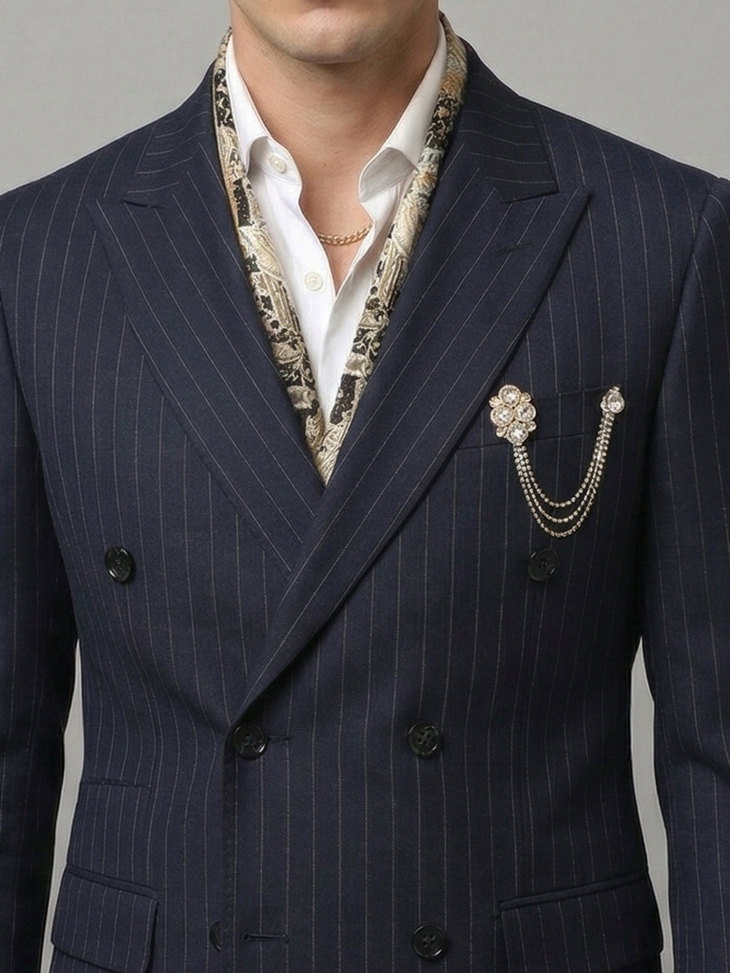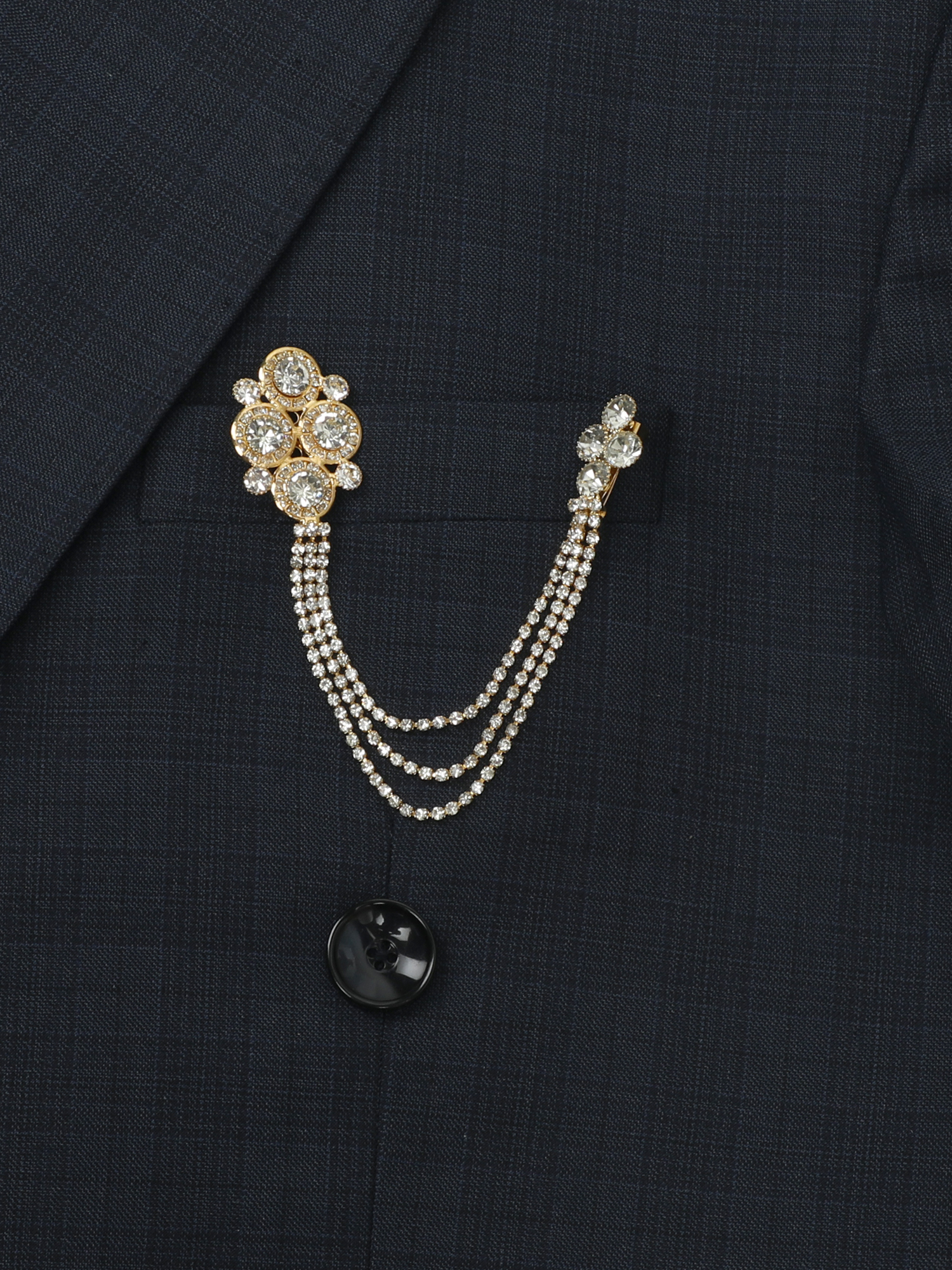 This Brooch is ideal for wedding wear, reception outfits, and festive occasions. The chain structure adds a unique styling element, while the crystal detailing enhances visibility. Therefore, it is perfect for groom styling and premium event looks.