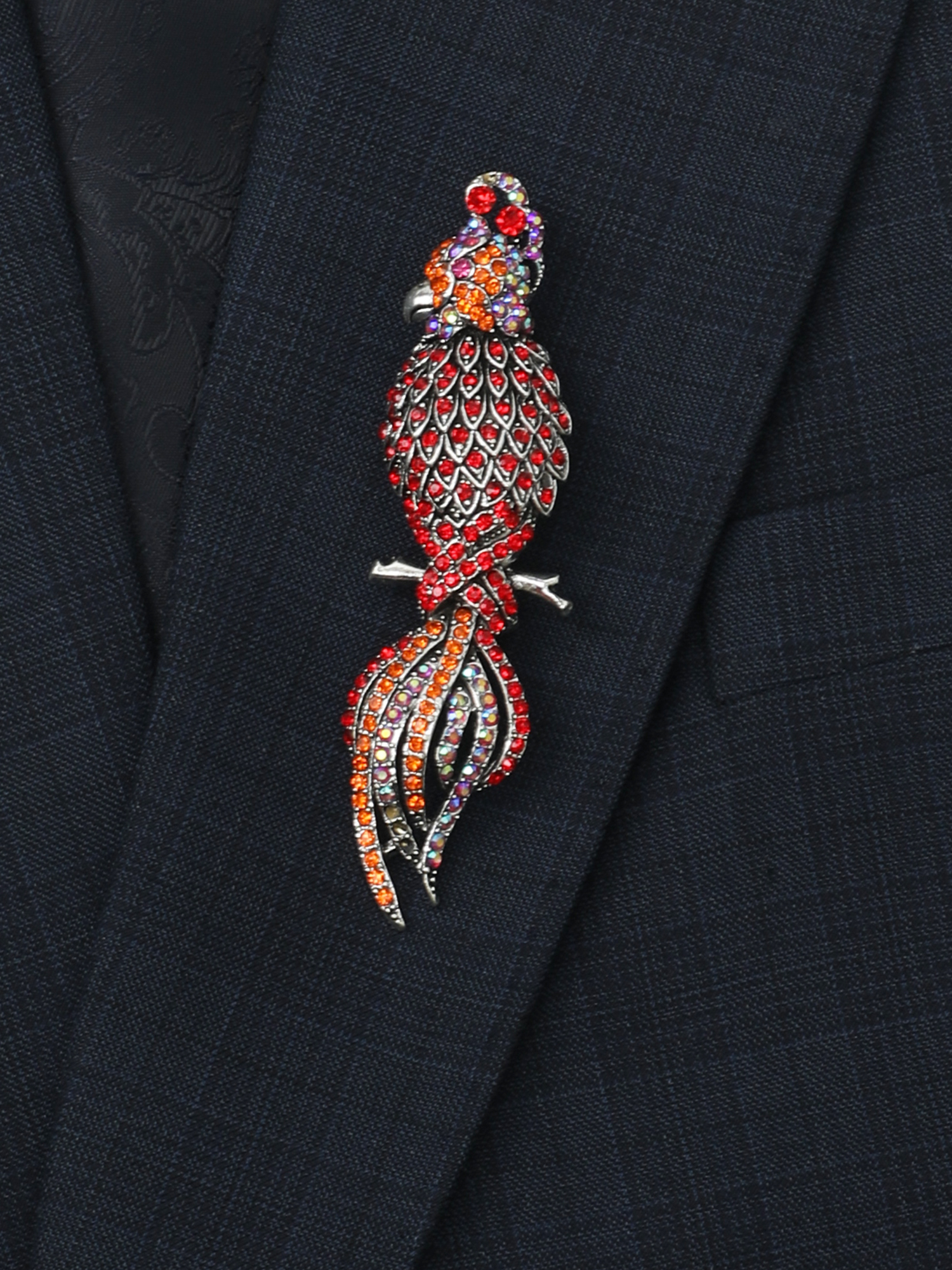This Brooch is crafted for reception wear, festive occasions, and luxury styling where artistic design defines individuality. The elongated parrot motif features vibrant multicolor crystal work, creating a bold and eye-catching appearance. Therefore, this Brooch is ideal for men who want to express a unique and high-fashion statement through their accessories.