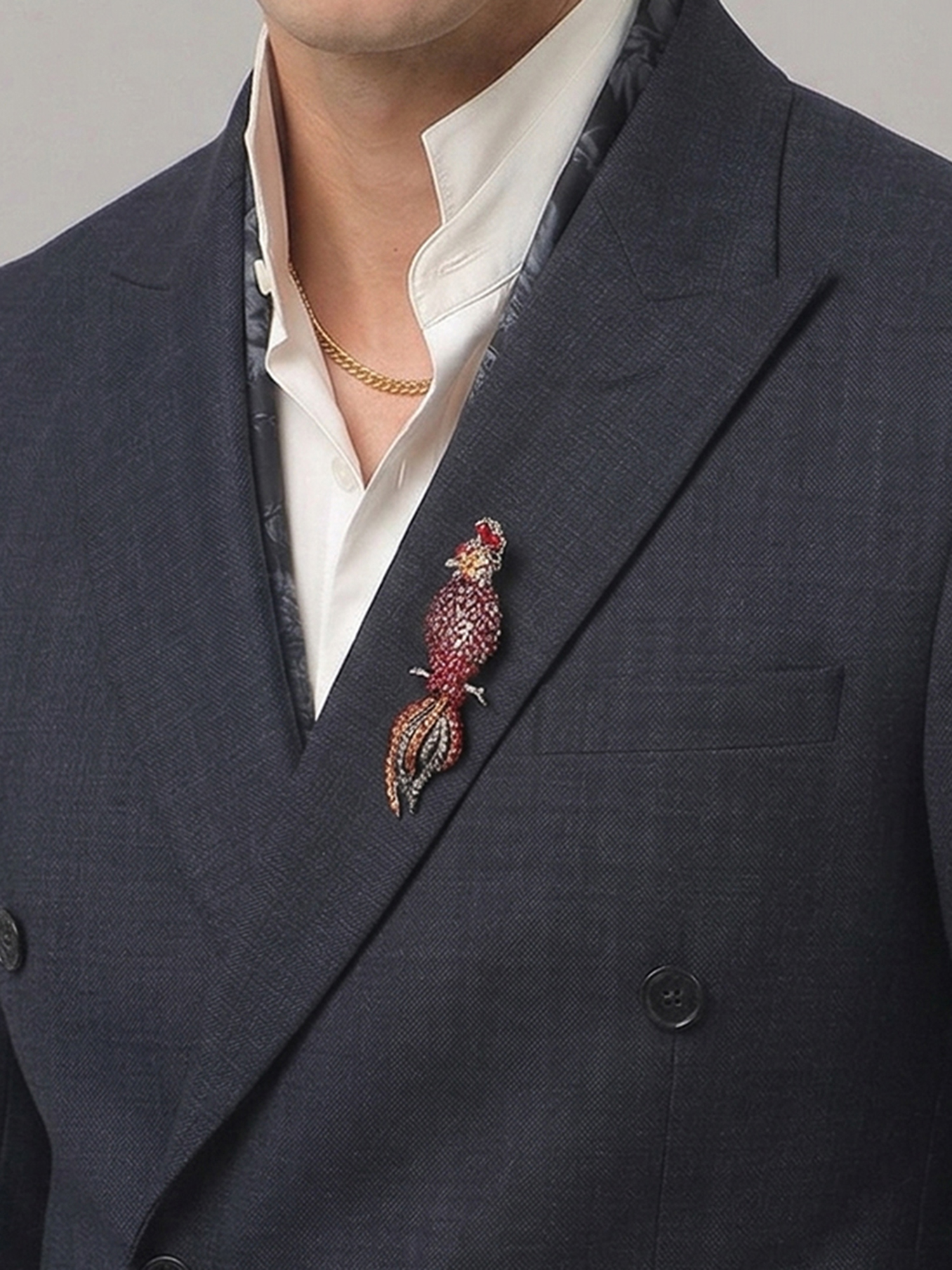 This Brooch is ideal for festive wear, reception outfits, and fashion-forward occasions. The unique shape and vibrant detailing make it a standout element, while the refined finish maintains elegance. Therefore, it is perfect for men who want to create a bold yet sophisticated look.