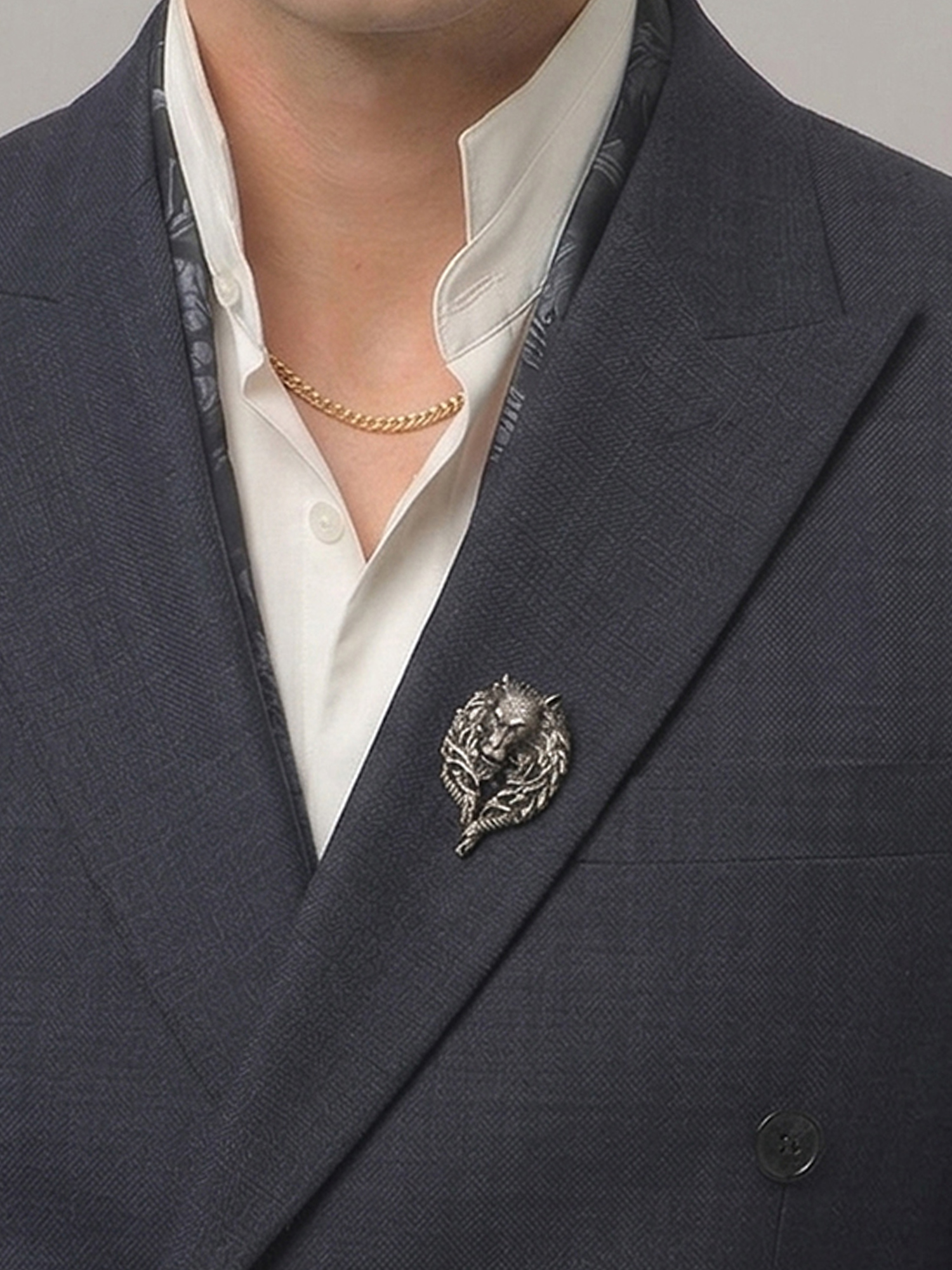 This Brooch is designed for reception wear, formal occasions, and evening styling where sharp identity and modern luxury define personal style. The wolf head motif represents intelligence, focus, and quiet power, while the flowing metal structure creates a bold yet refined appearance. Therefore, this Brooch becomes an ideal accessory for men who prefer confident styling with a subtle edge.