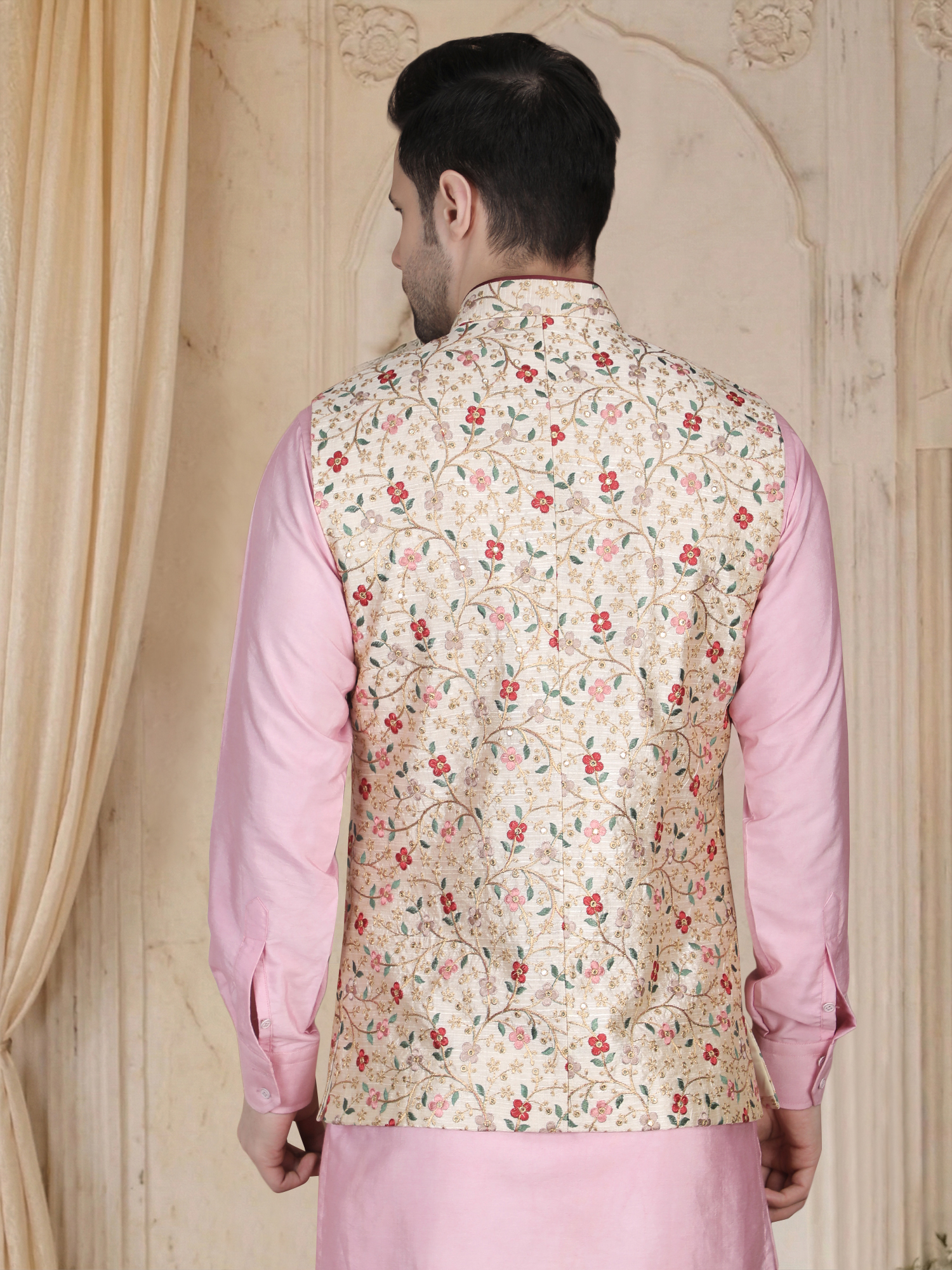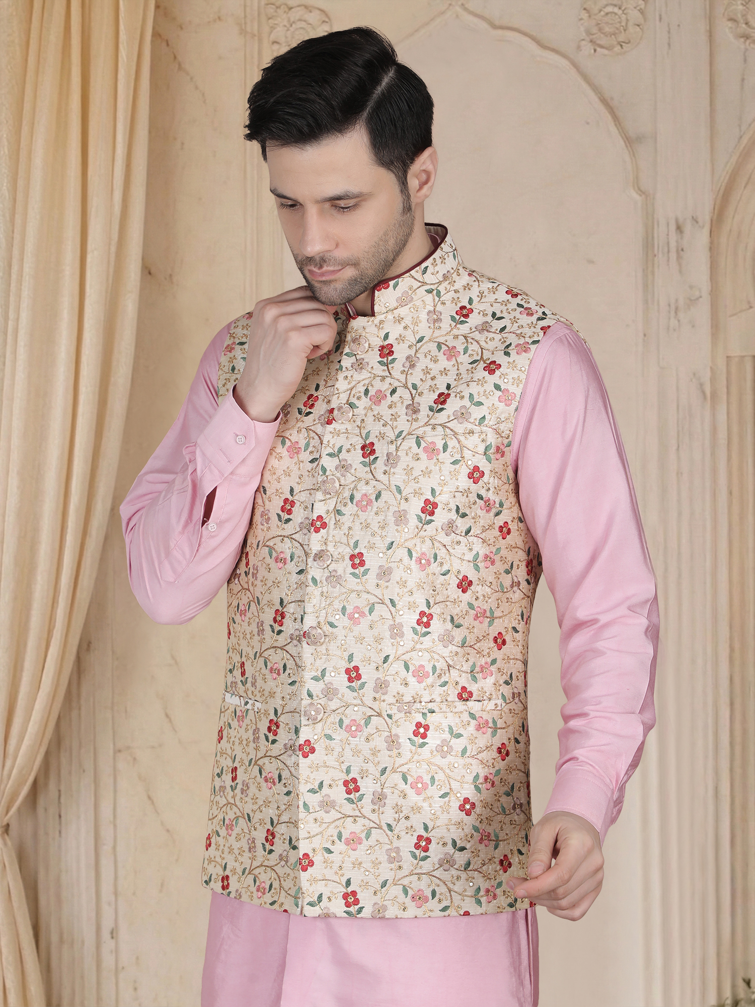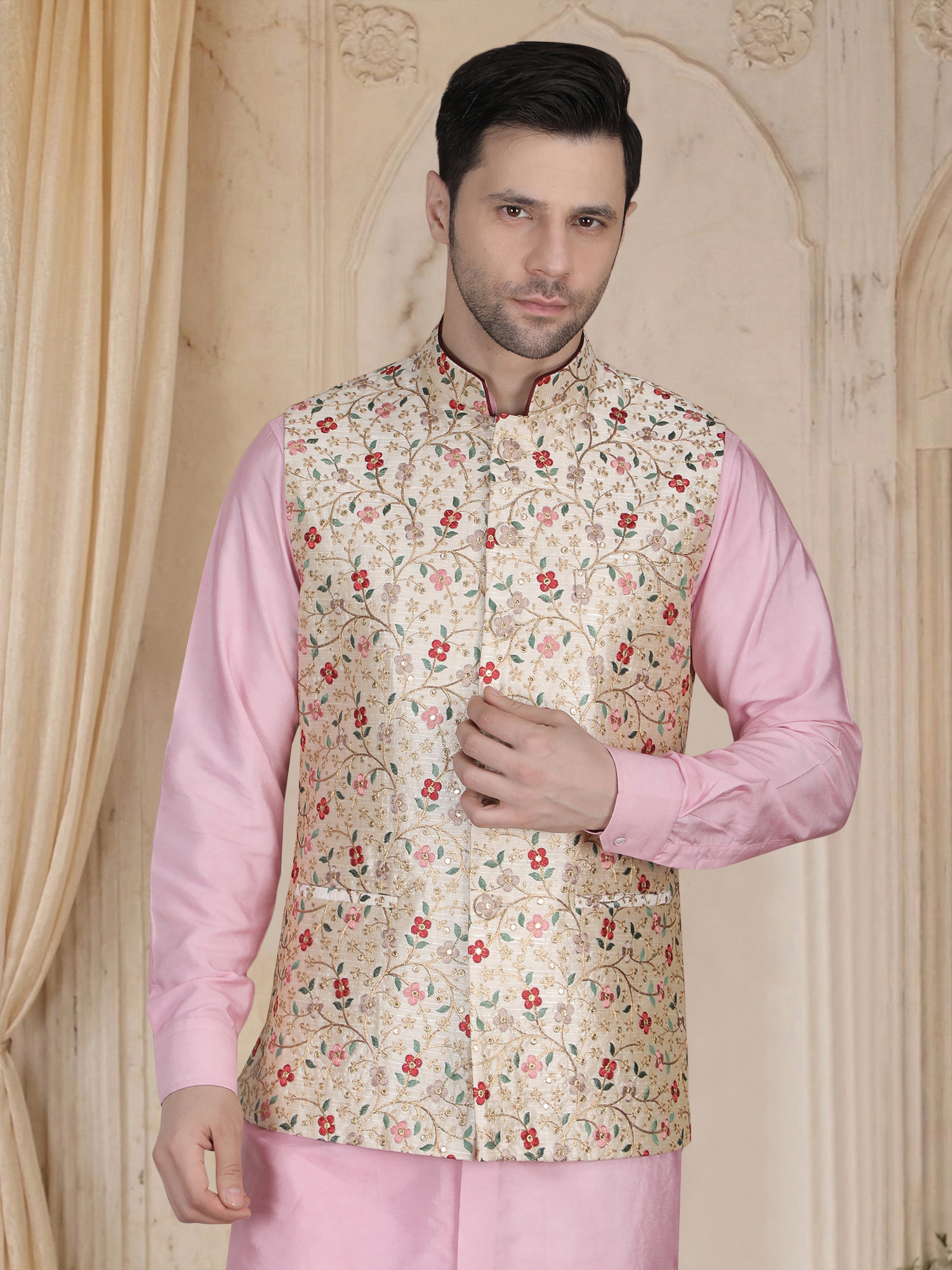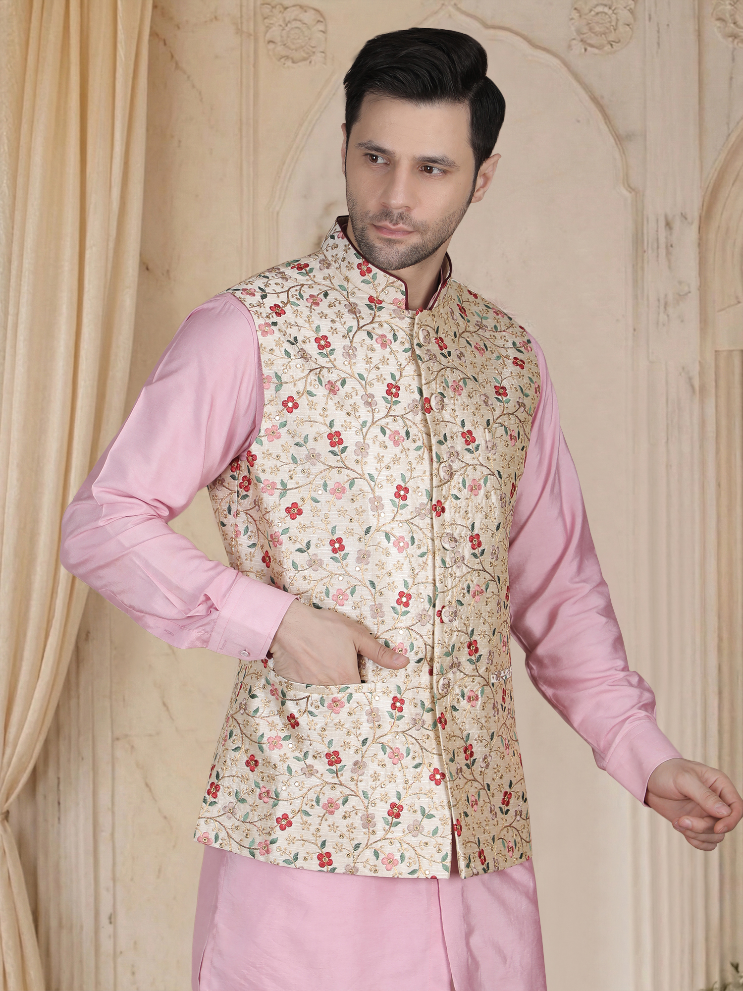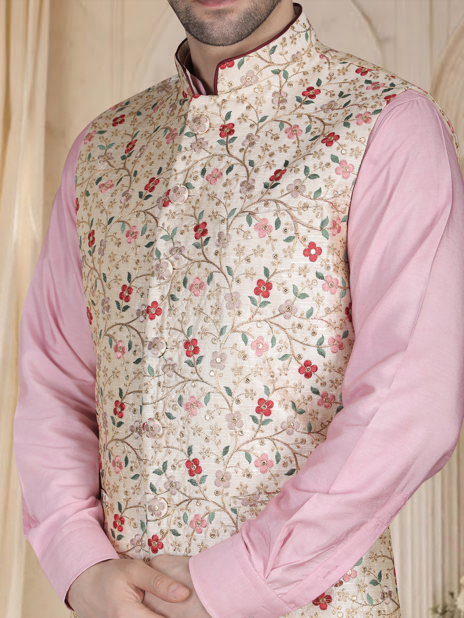 Cream Floral Embroidery Nehru Jacket Set for Reception