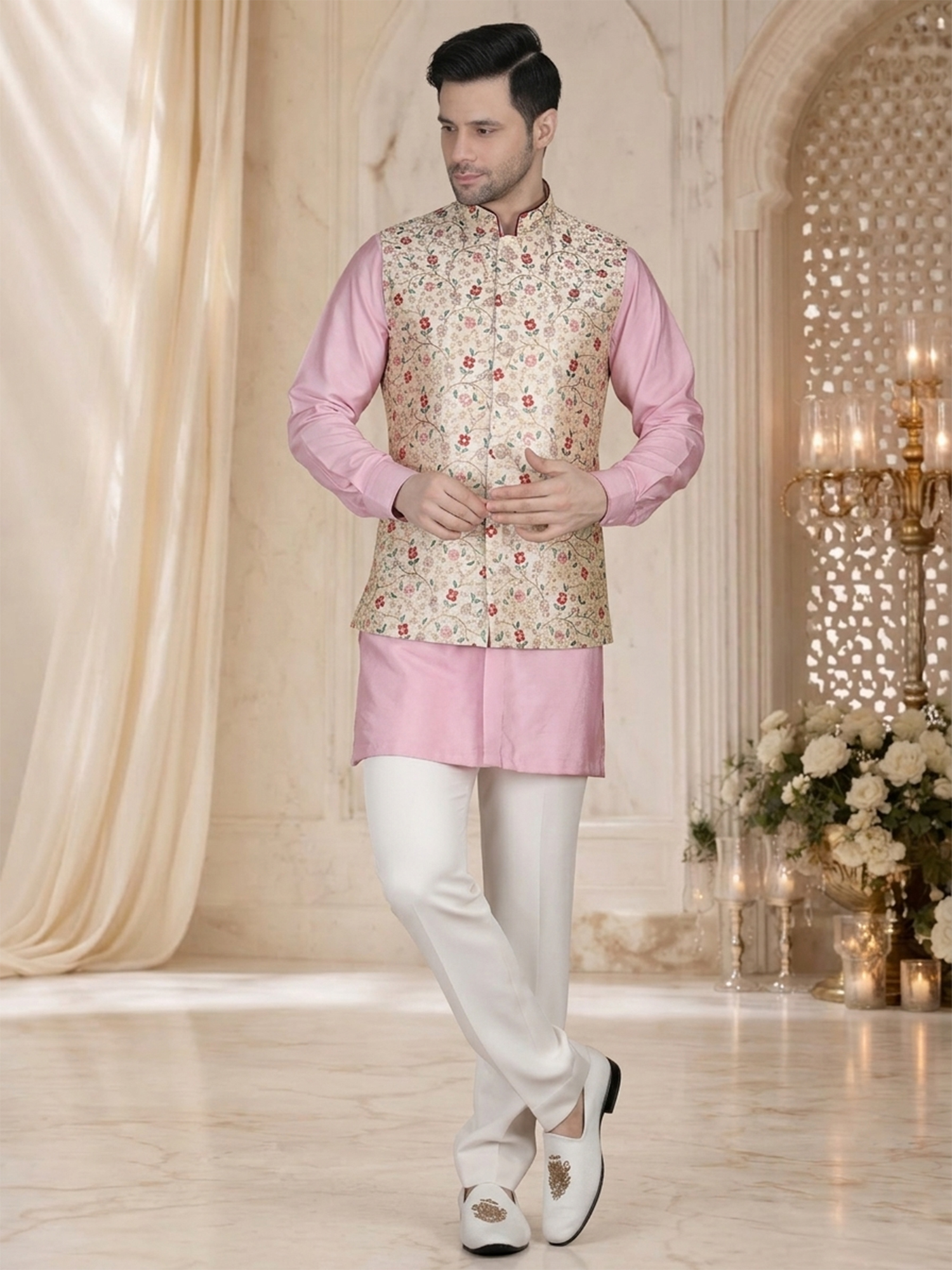 This Cream Floral Embroidery Nehru Jacket Set is designed for reception occasions where soft tones and detailed embroidery create a fresh and elegant look. The Nehru jacket features intricate floral embroidery spread across the surface, which adds richness and texture to the outfit. The embroidery uses multi-color thread work that stands out beautifully against the cream base, so it creates a balanced and eye-catching appearance. Therefore, this Cream Floral Embroidery Nehru Jacket Set becomes an ideal choice for men who prefer a light yet stylish look for reception events. Moreover, the soft cream tone enhances the embroidery, which gives the outfit a graceful and premium feel.