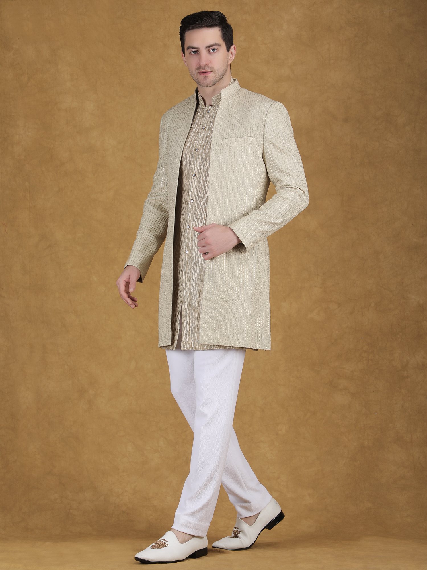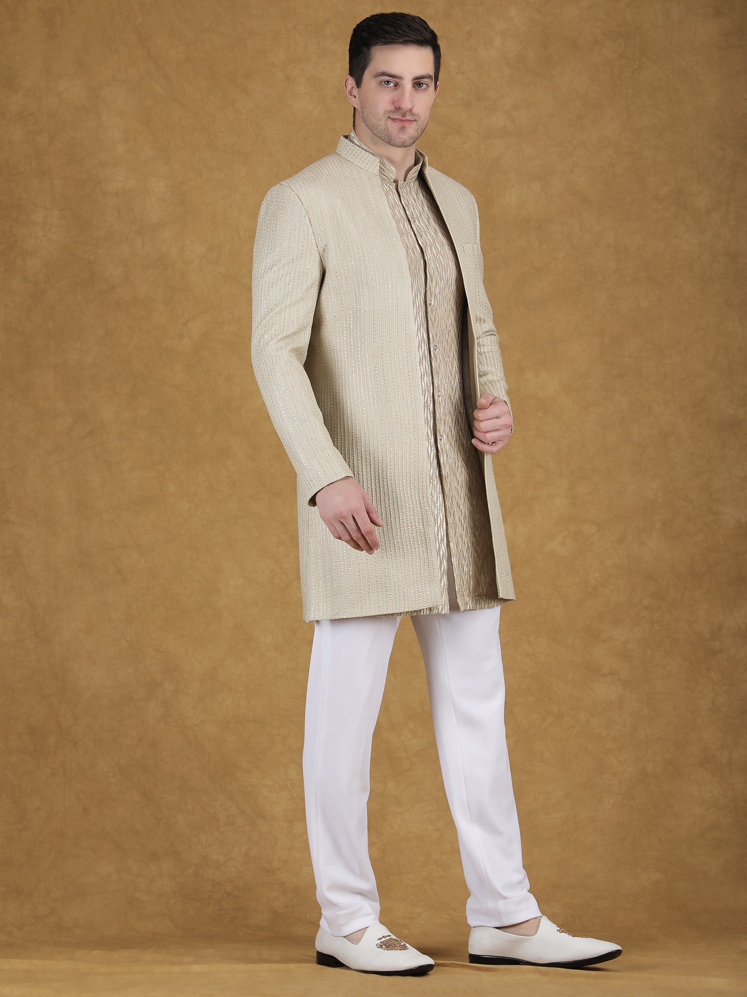 This gold textured sequin sherwani for men is a perfect blend of modern elegance and timeless design. It is crafted for men who prefer a refined and sophisticated look on special occasions. Featuring tone-on-tone micro sequin embroidery on a rich gold base, this sherwani offers a subtle shine without appearing too heavy. Therefore, it is an ideal choice for weddings, receptions, and festive celebrations.