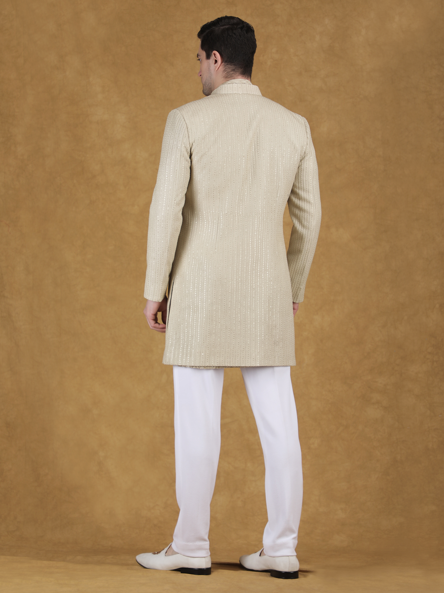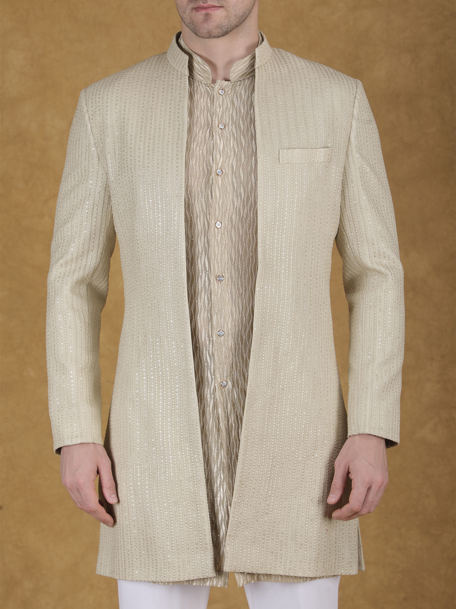 Crafted Gold Sequin Sherwani for Men – Fabric & Craftsmanship from a premium textured silk blend fabric, this sherwani delivers both comfort and structure. The fabric feels smooth on the skin while maintaining a sharp silhouette. Also, the linear textured pattern enhances the overall depth of the design. The micro sequin embroidery is evenly spread across the surface, creating a soft shimmer under light. Moreover, the fine finishing and neat detailing reflect high-quality craftsmanship.