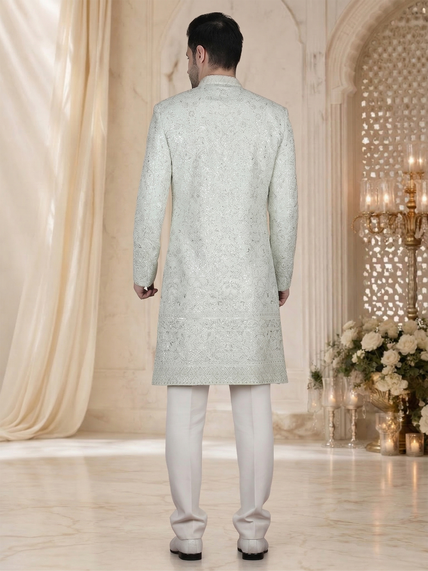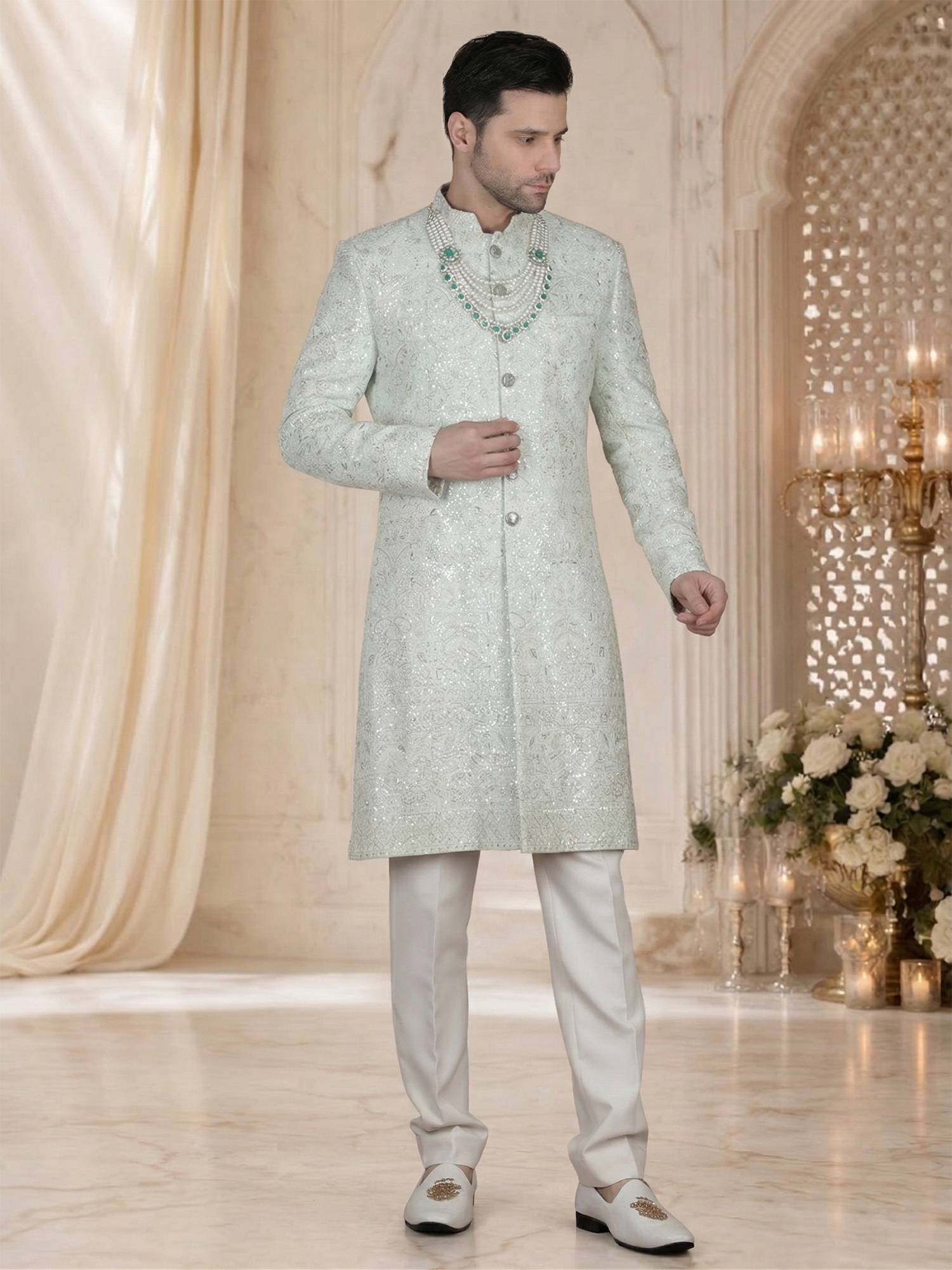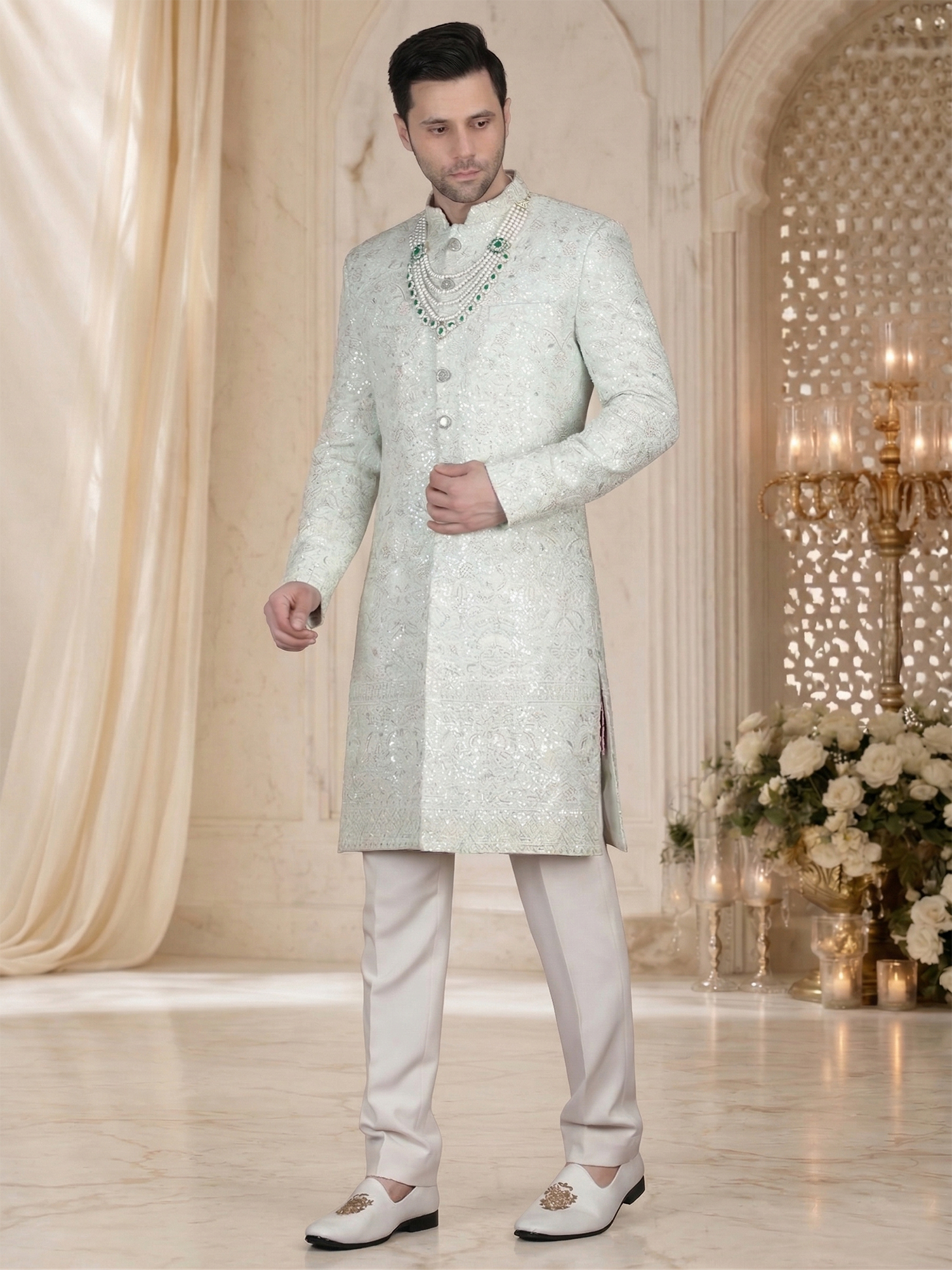 This Mint Sequin Embroidery Sherwani is perfect for reception functions, day-evening celebrations, and modern festive gatherings. The light tone combined with subtle shimmer makes it especially suitable for well-lit events where the embroidery can reflect naturally. The outfit delivers a premium presence without heavy contrast or bold elements. Therefore, you can wear it comfortably for long hours while maintaining a refined and balanced appearance.