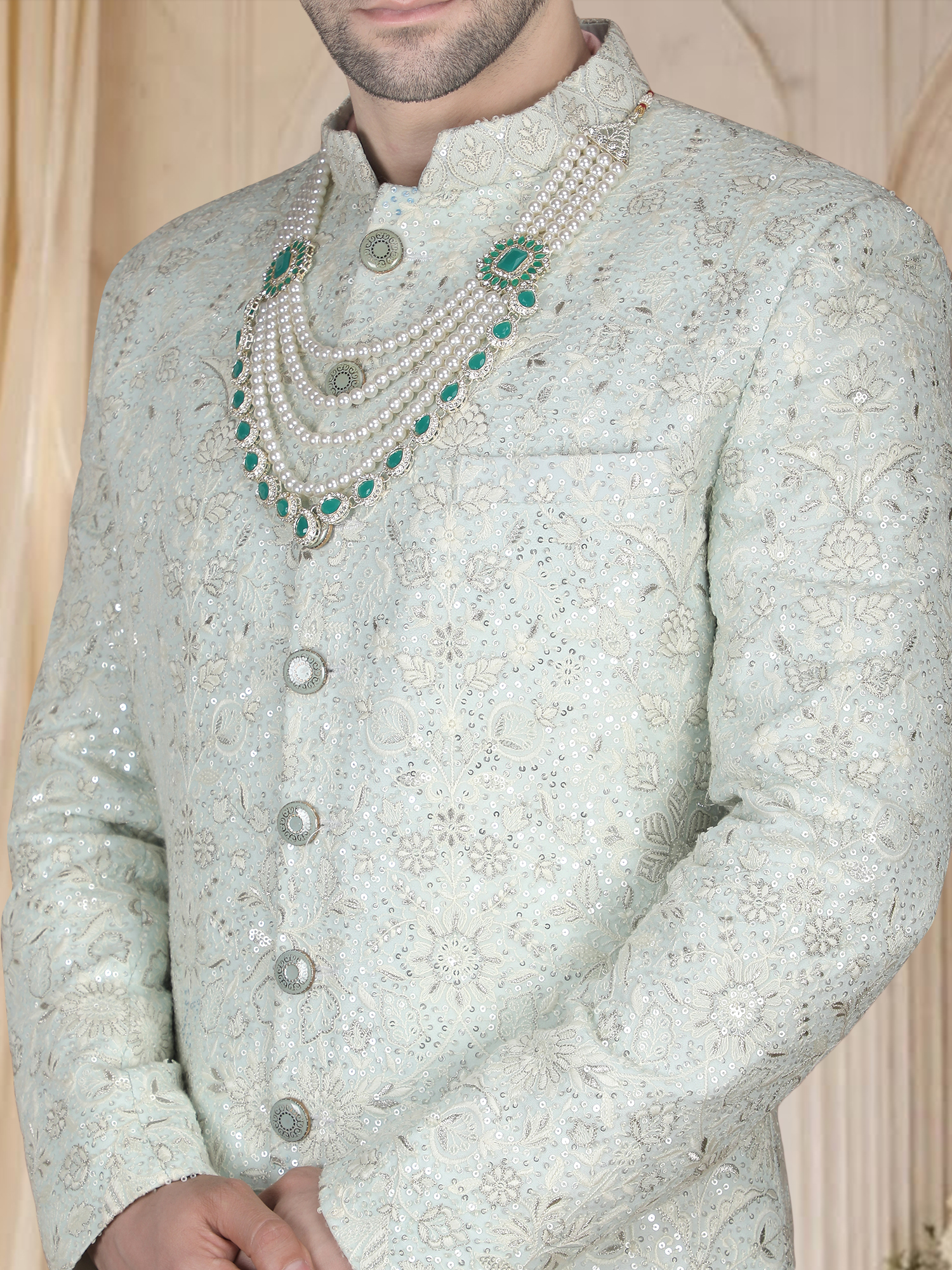 This Mint Sequin Embroidery Sherwani is designed for men who want a fresh, elegant, and visually rich reception look with fine detailing. The soft mint base creates a light and sophisticated foundation, while dense sequin and thread embroidery builds a textured and luminous surface across the outfit. The embroidery features delicate floral motifs combined with evenly distributed sequins that create a subtle shimmer. The shine is controlled and refined, adding brightness without making the outfit overly flashy. Therefore, this Mint Sequin Embroidery Sherwani becomes an ideal choice for reception events where a soft yet premium appearance stands out. Moreover, the structured silhouette enhances the personality, offering a clean and graceful presence.