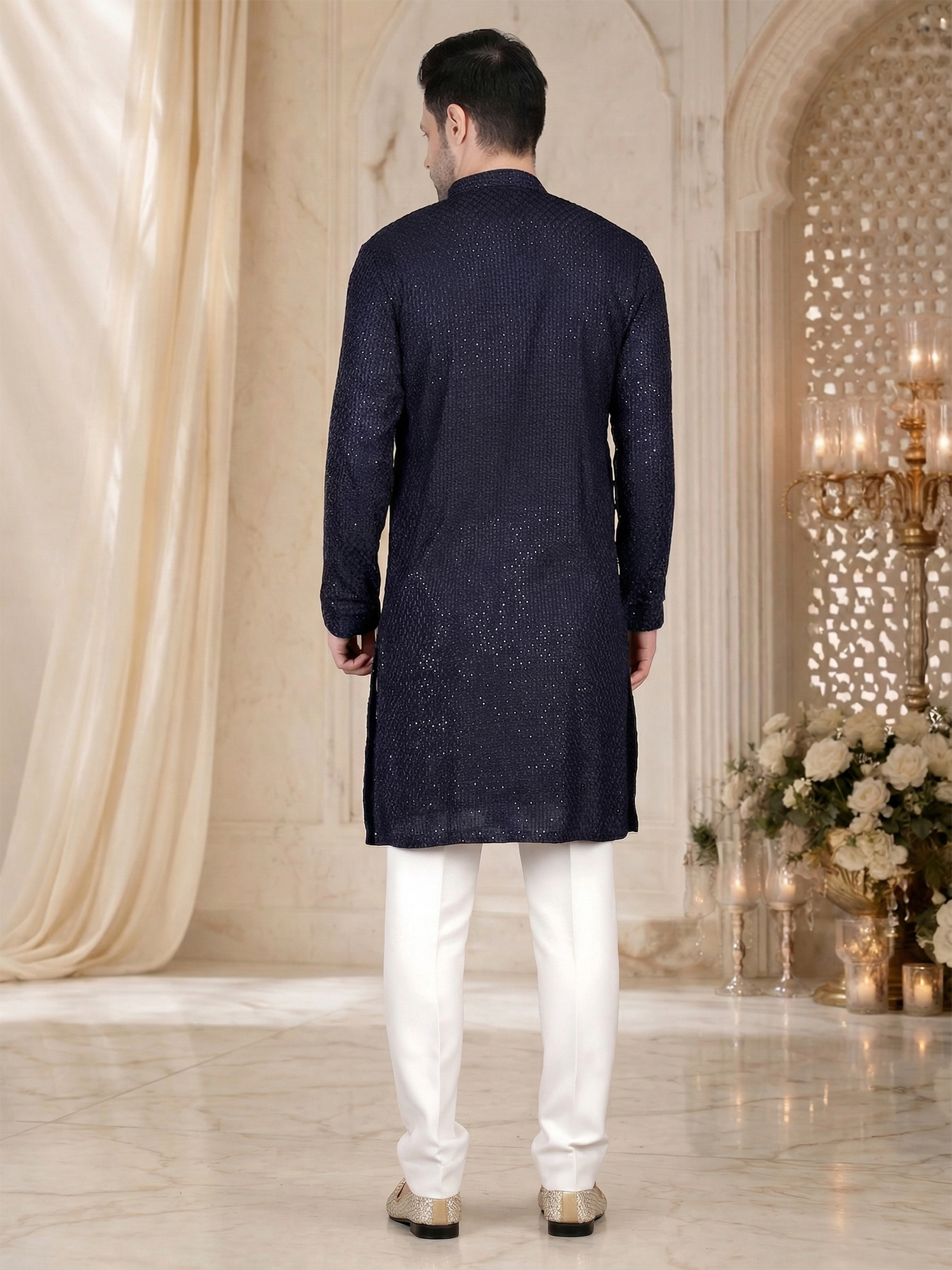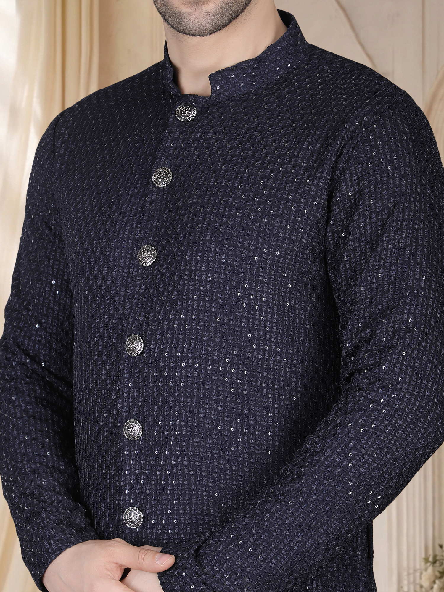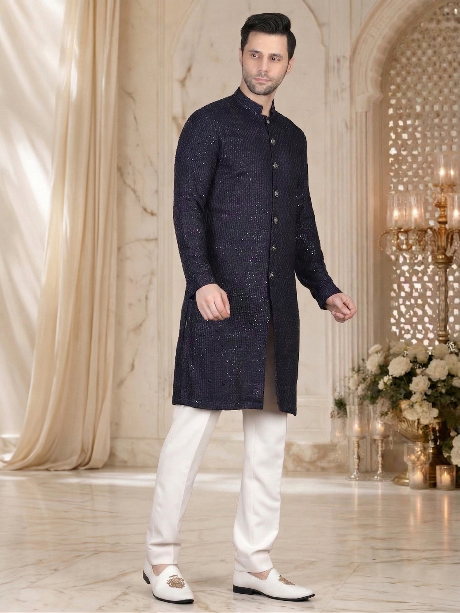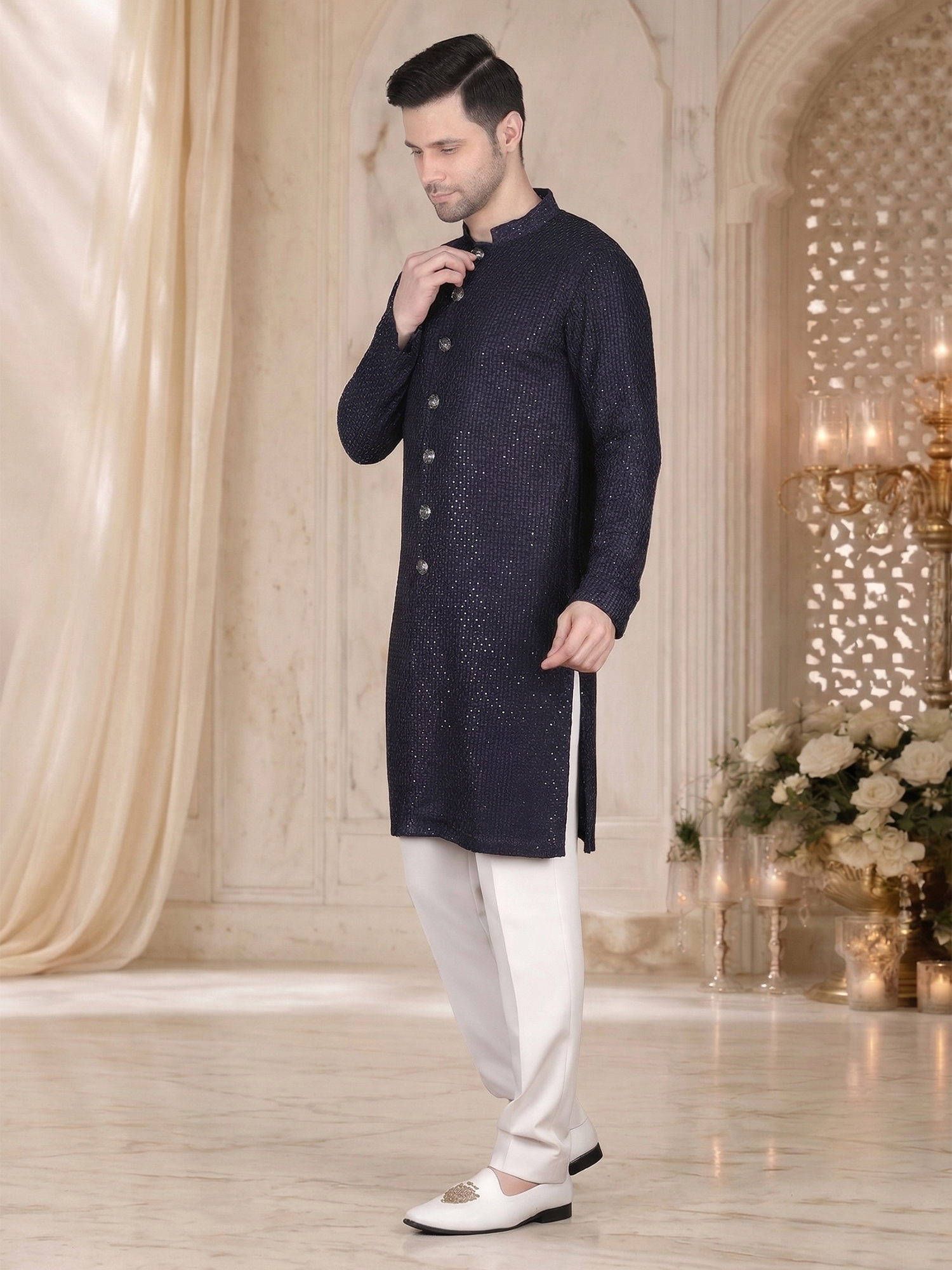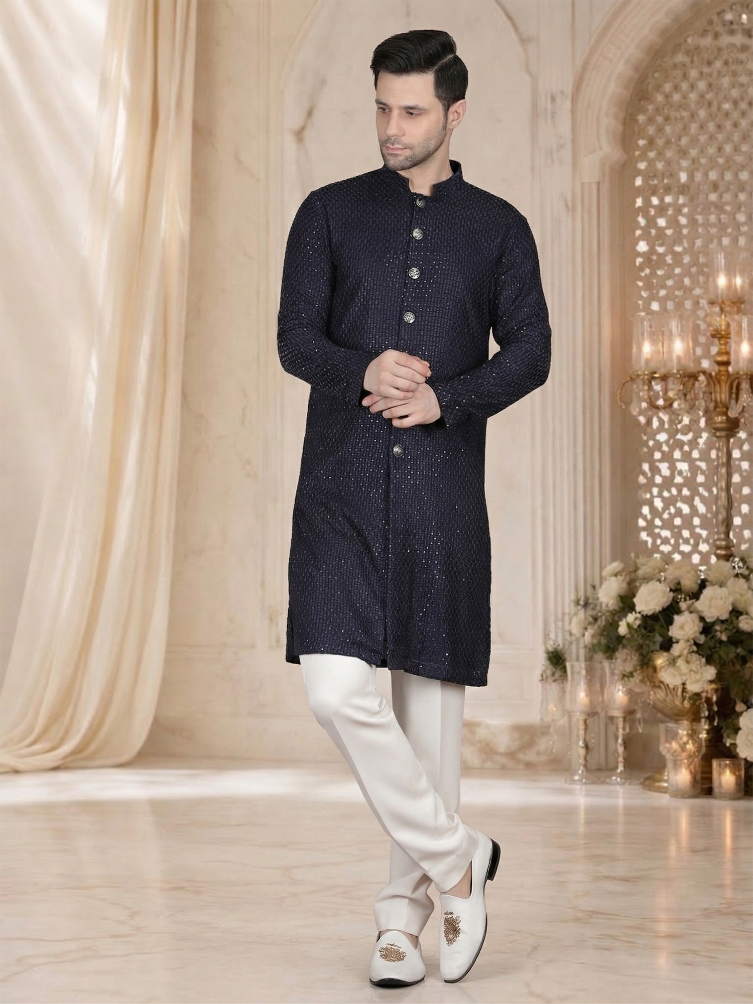 This Navy Blue Self Texture Kurta Set is designed for reception occasions where deep color and subtle detailing create a refined and premium look. The kurta features a fine self-textured pattern across the fabric, which adds depth without heavy embroidery. The micro texture enhances the surface, so it reflects light softly and gives a rich appearance. Therefore, this Navy Blue Self Texture Kurta Set becomes an ideal choice for men who prefer understated elegance with a modern touch for reception events. Moreover, the navy blue tone adds sophistication and evening-ready appeal.
