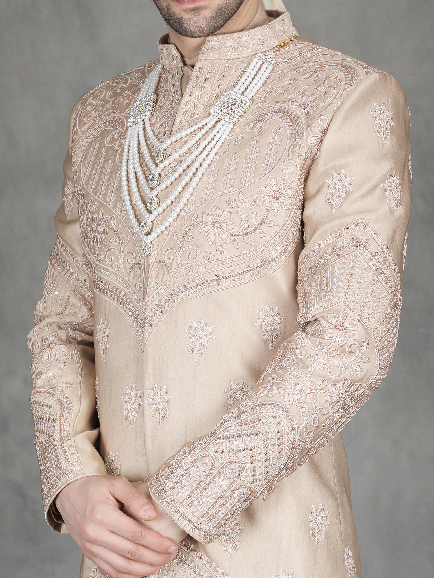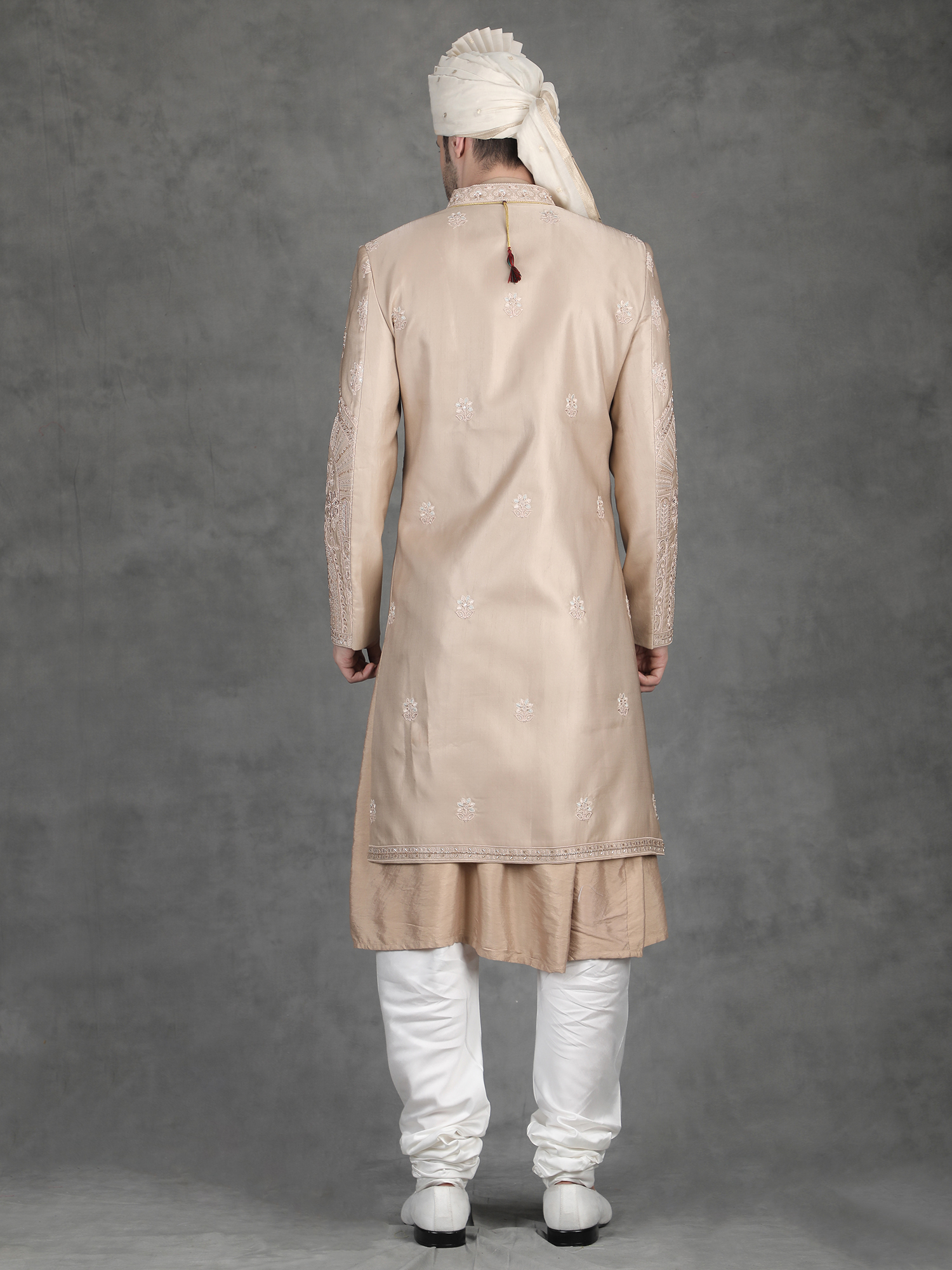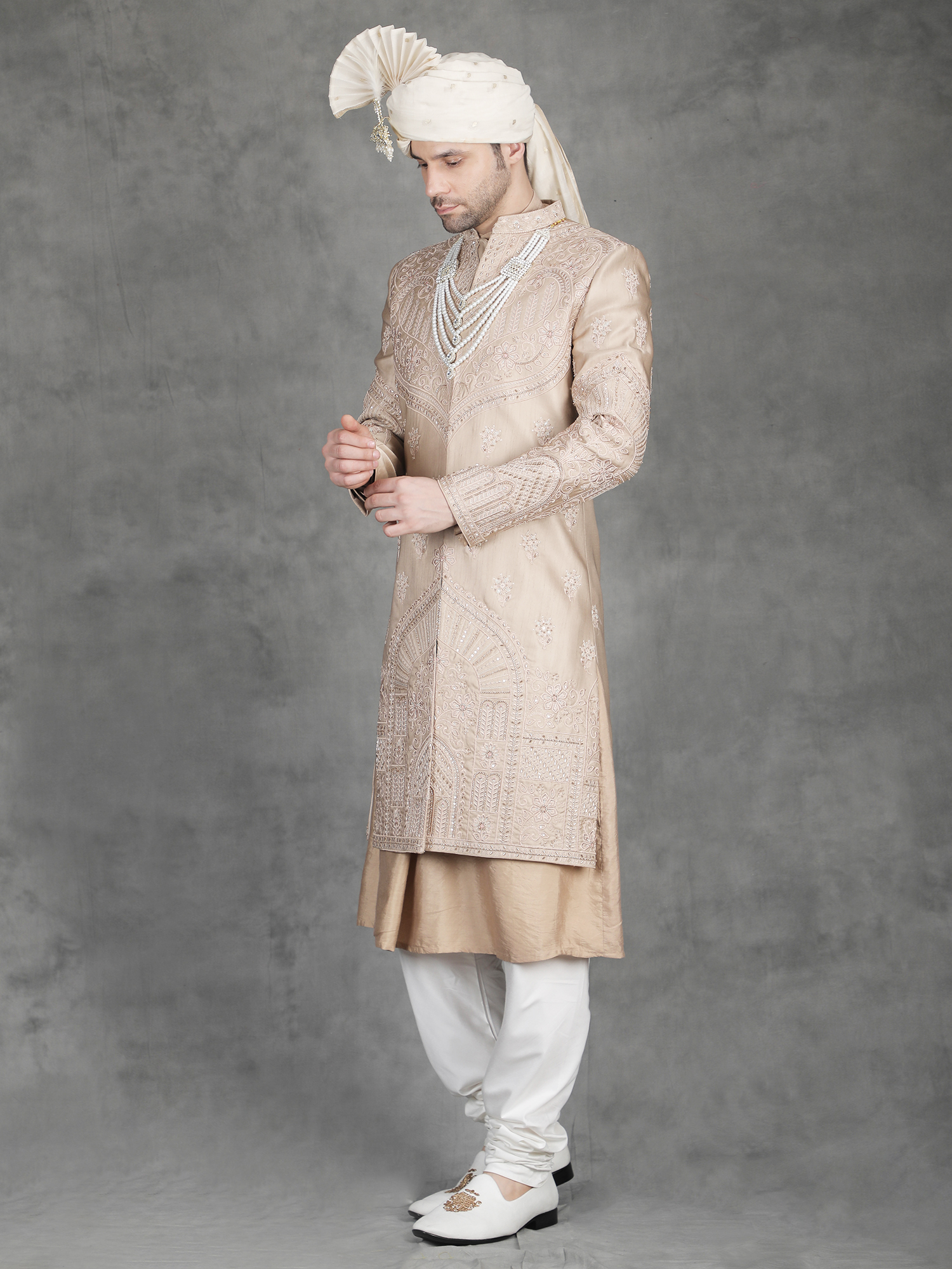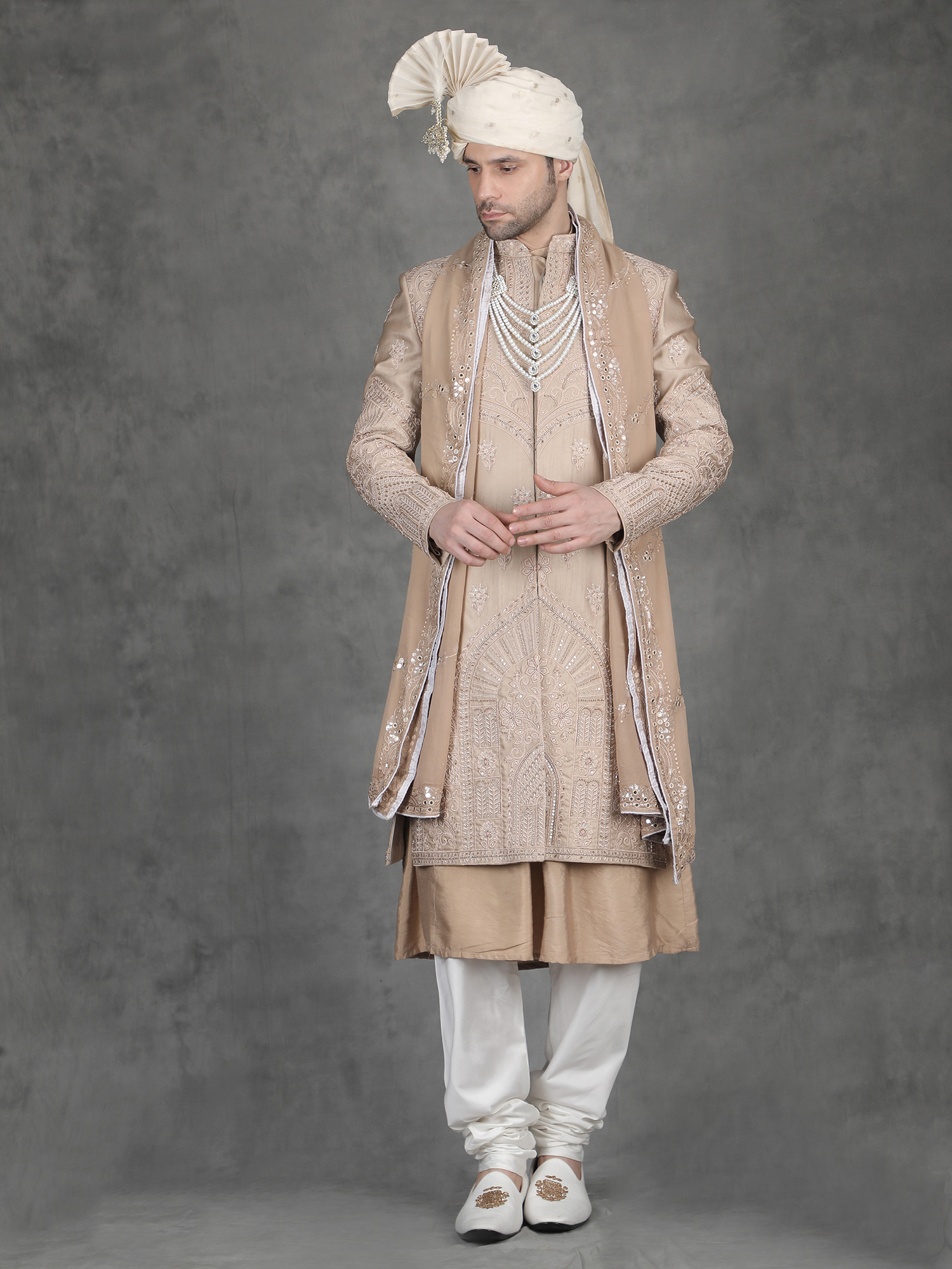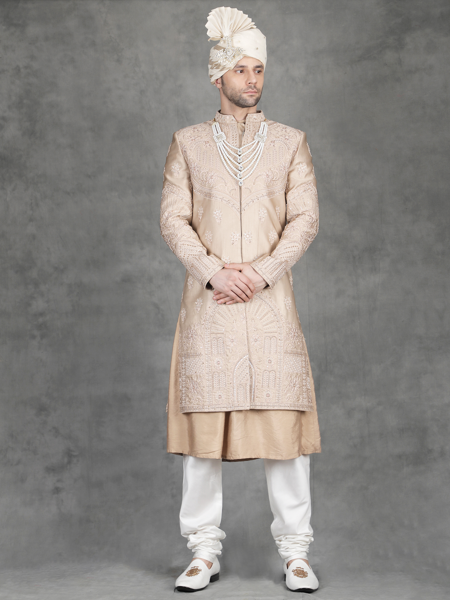 Pair this sherwani with churidar or fitted trousers for a clean traditional look. Add layered malas or a statement brooch to enhance the embroidery richness. Complete the outfit with embroidered mojris.