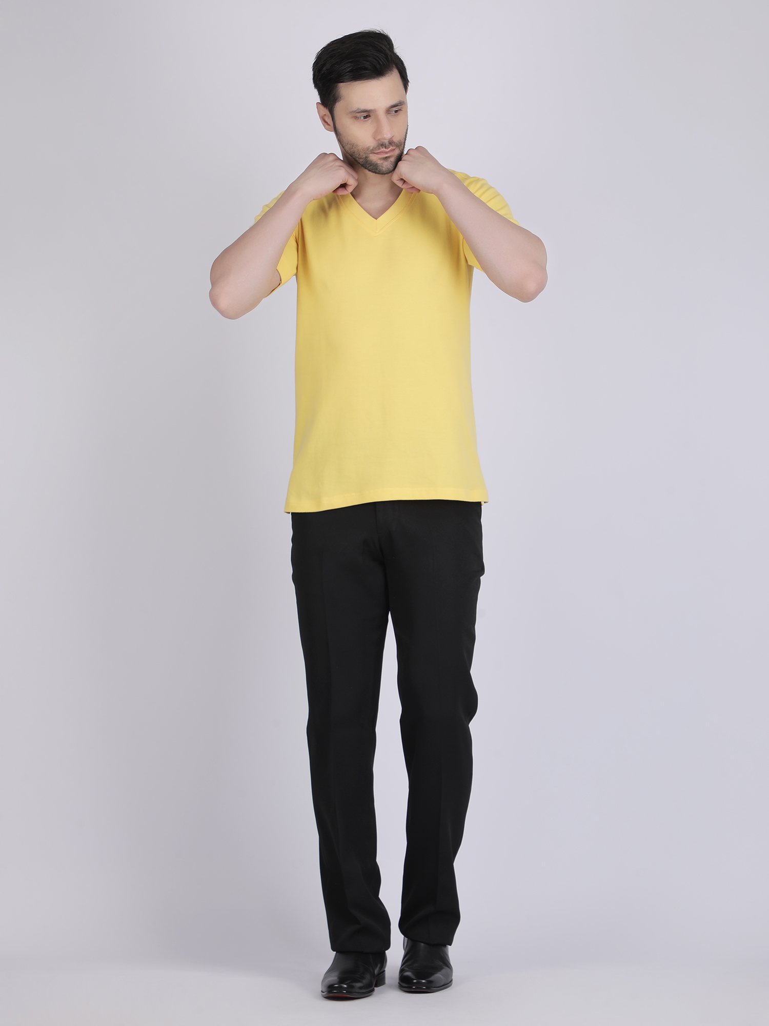 Stay stylish with this vibrant yellow V-neck t-shirt, crafted for modern men who appreciate quality