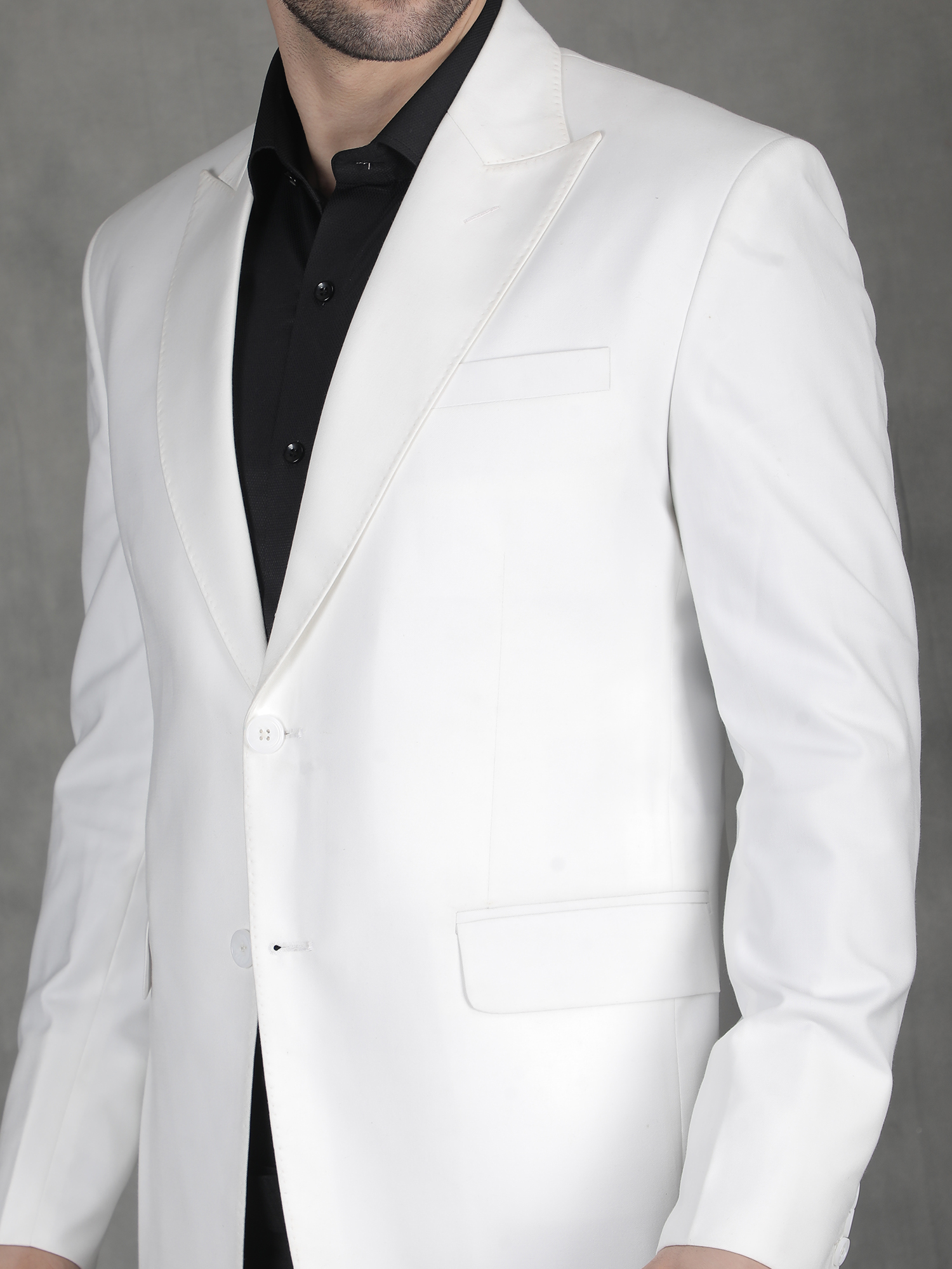 Pair this blazer with a black shirt and black trousers for a classic contrast look. Keep accessories minimal and complete the outfit with formal shoes.