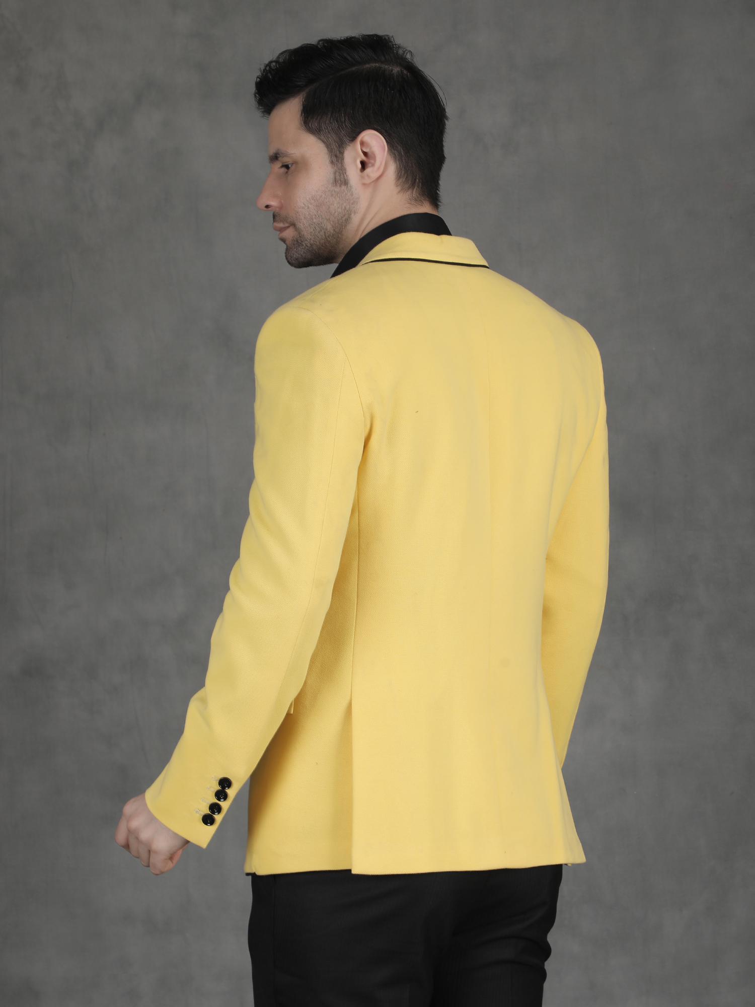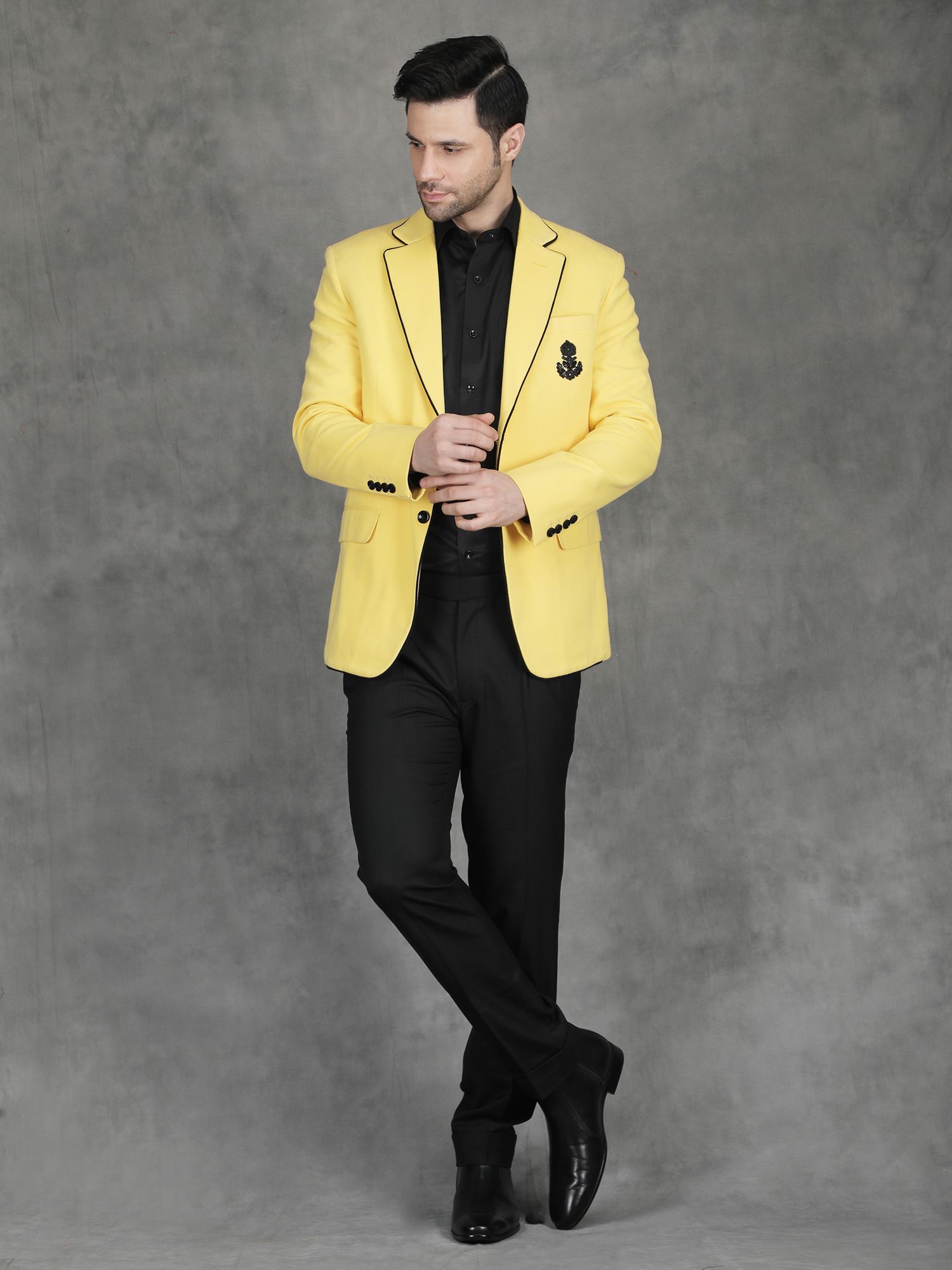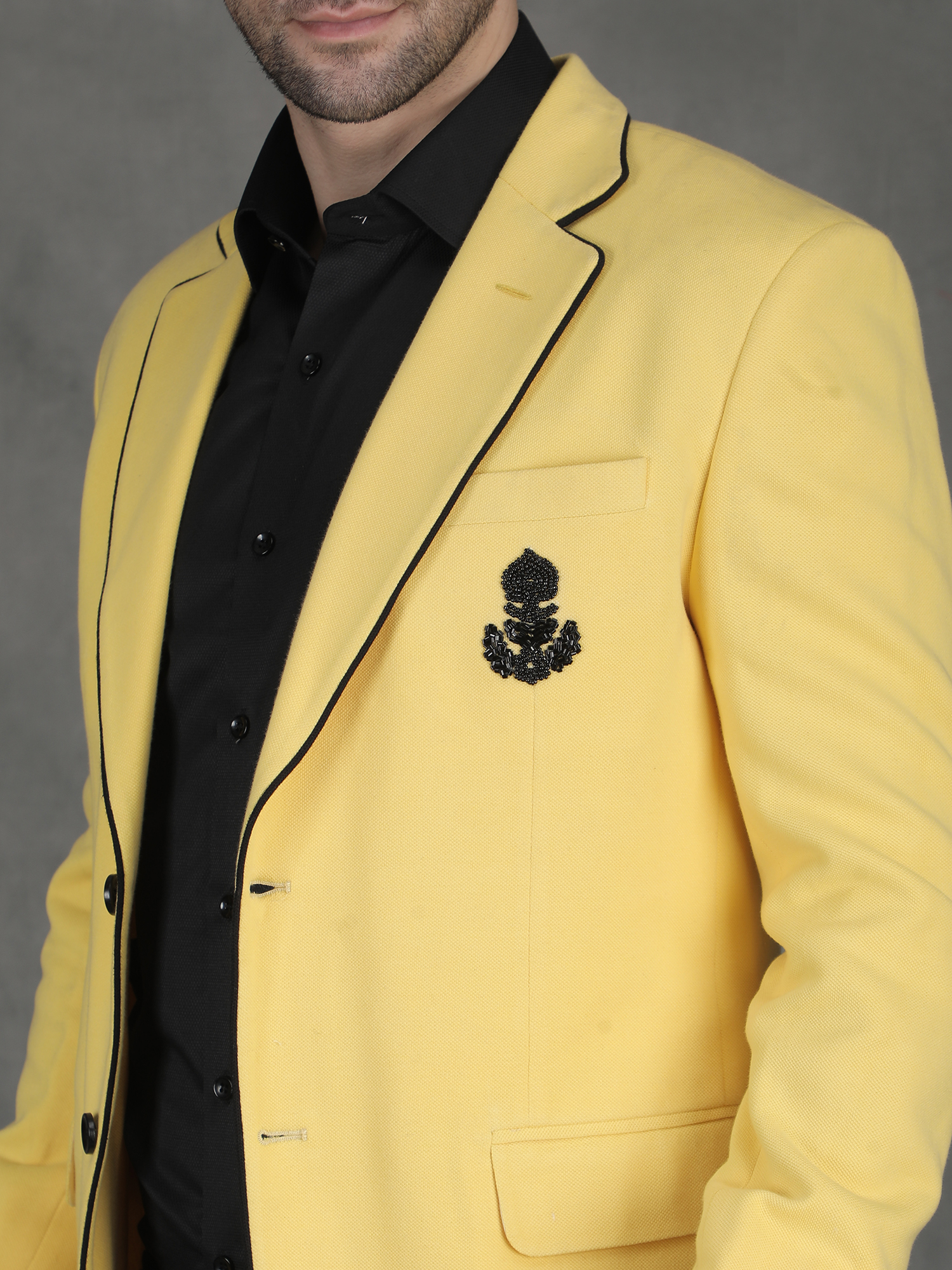 This Yellow Knitted Embroidery Blazer delivers a bold and vibrant look designed for reception and festive evening occasions. The bright yellow tone creates a striking and energetic presence, making it ideal for men who want to stand out with confidence. The chest embroidery adds a refined and premium highlight, giving the outfit a balanced touch of detail. Therefore, this Yellow Knitted Embroidery Blazer becomes an excellent choice for modern celebrations where style and individuality matter. Moreover, the contrast piping enhances the structure, adding a clean and polished finish to the overall design.